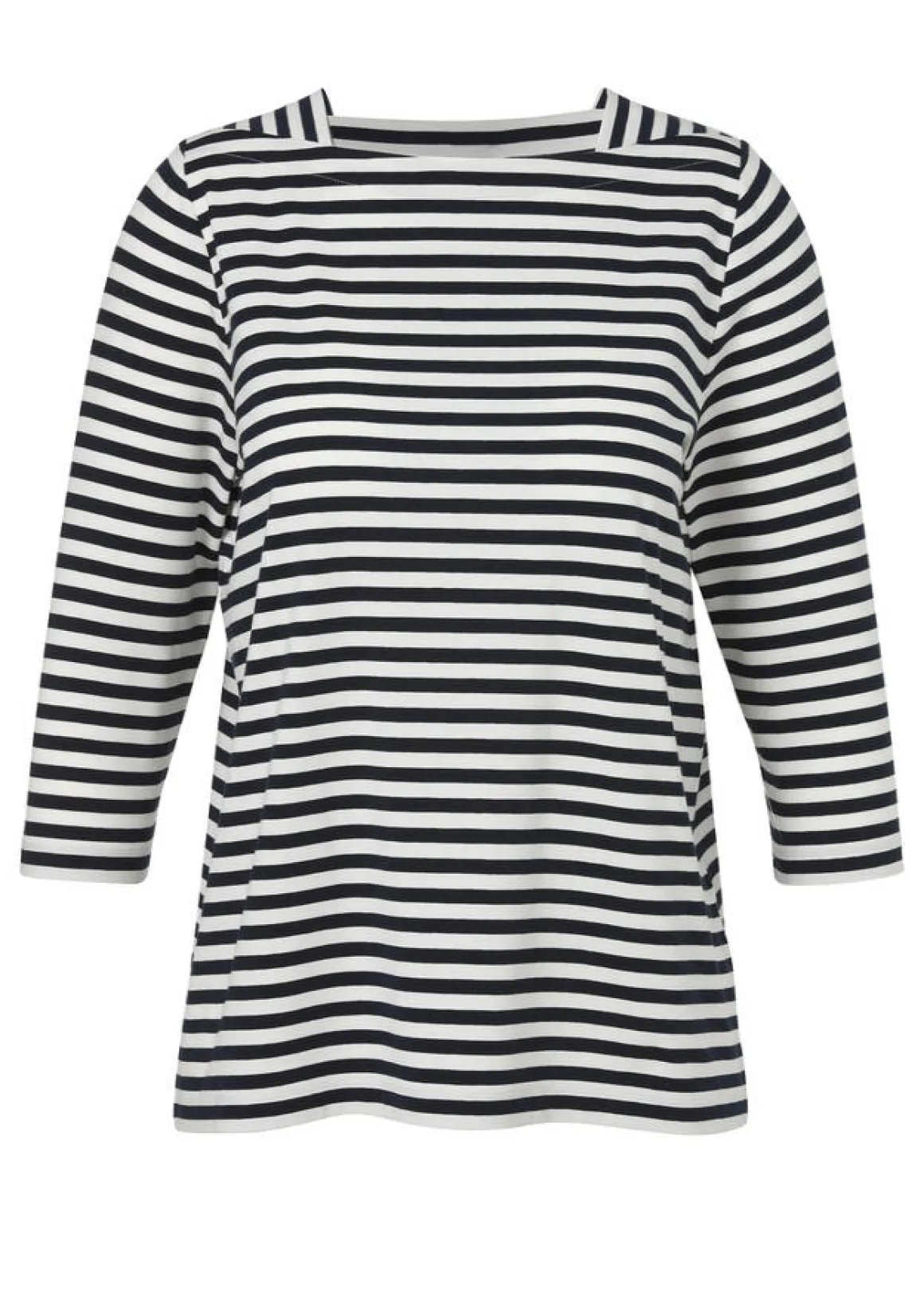 Feminines Ringelshirt mit 3/4-Ärmeln und einem femininen Karree-Ausschnitt für zeitlos schöne, fröhliche Looks. Sehr bequem und mit hohem Tragekomfort in einem locker figurumspielenden Schnitt.