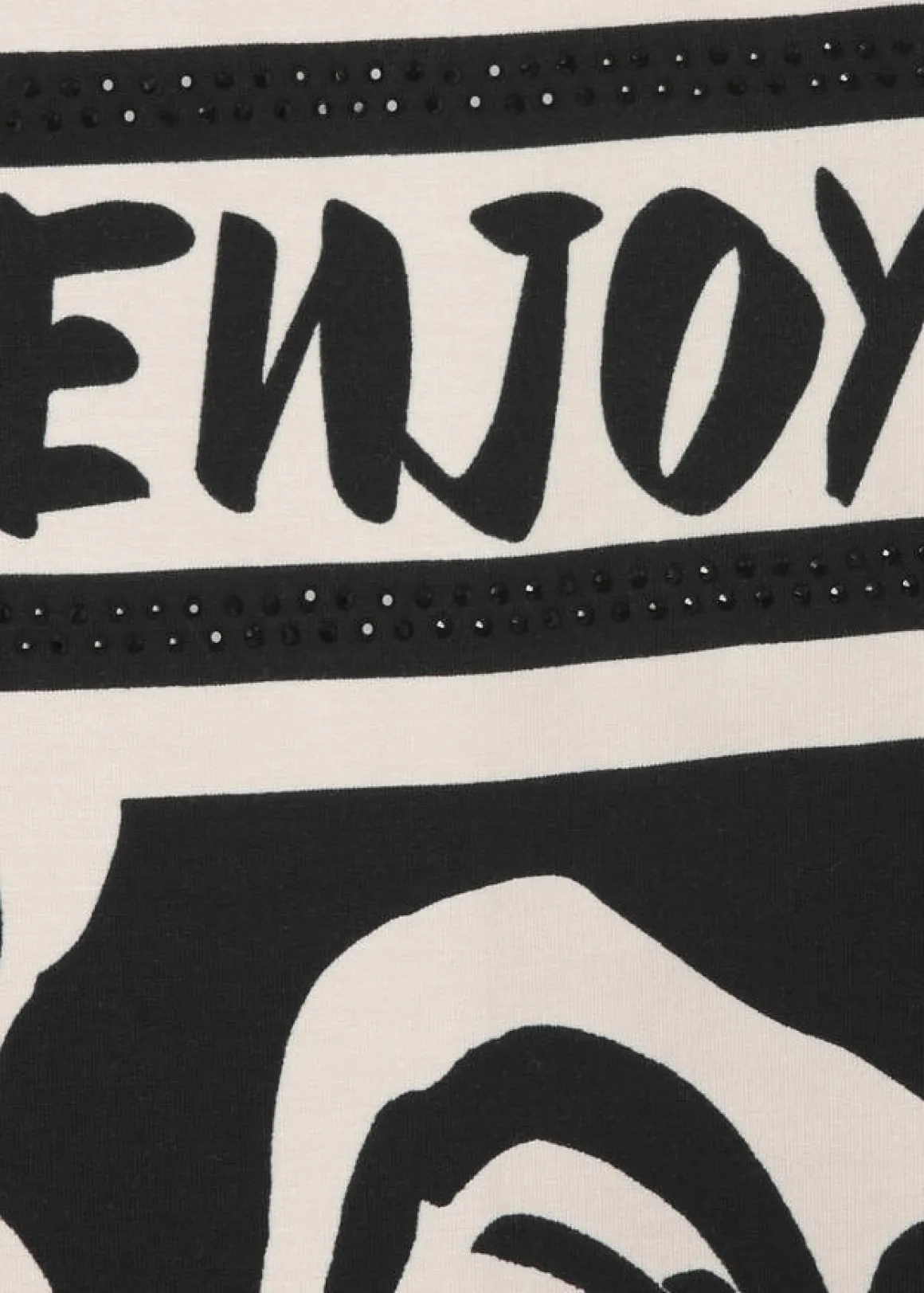 Edles Bicolor Sweatshirt in Schwarz / Champagner mit Allover-Print. Mustermix aus Streifen, floralen Elementen und Letter-Print: Enjoy life!