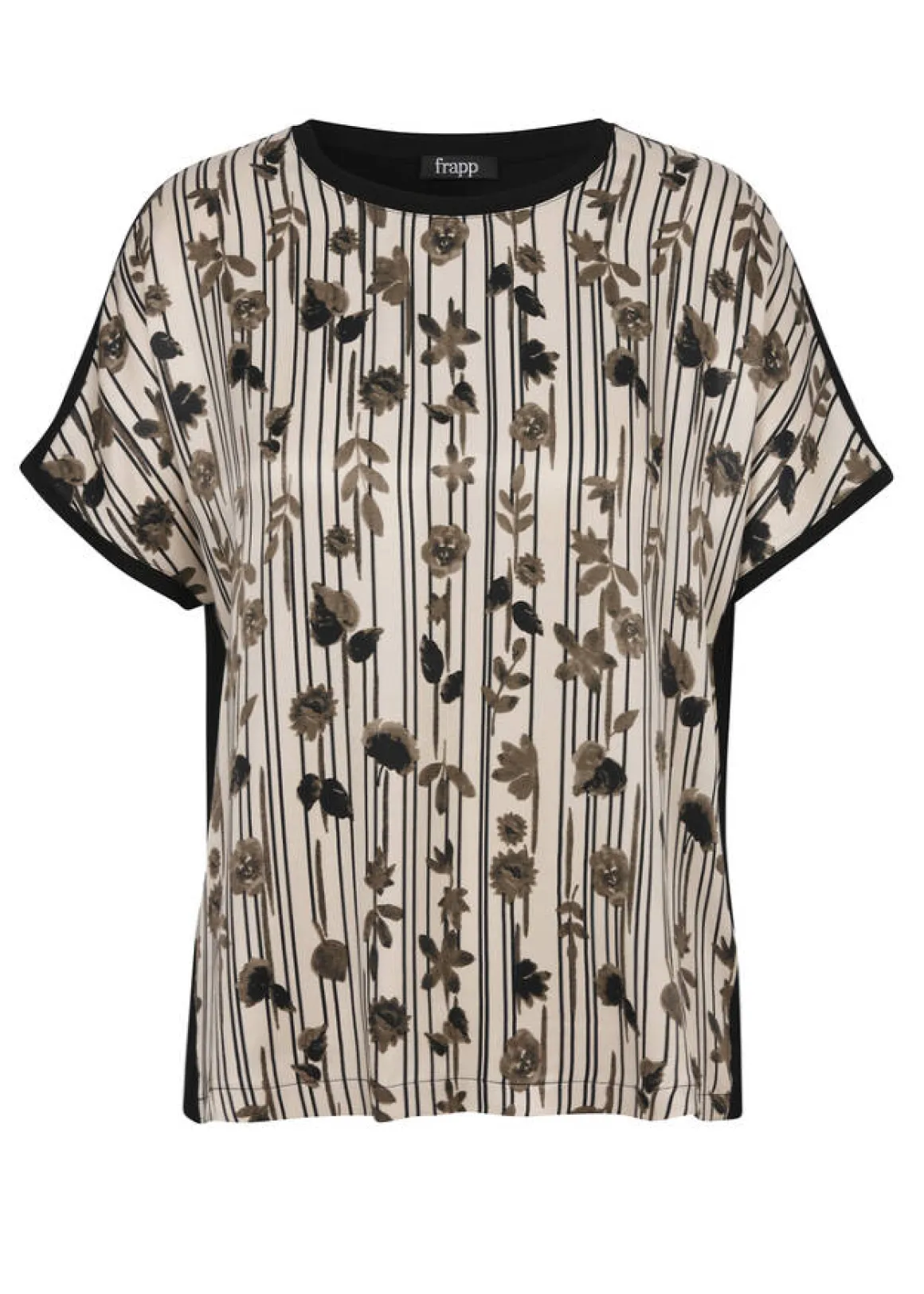 Feines Blusenshirt mit floralem Print in edler Farbharmonie. Der Rücken ist einfarbig Schwarz aus softem Viskose-Jersey.