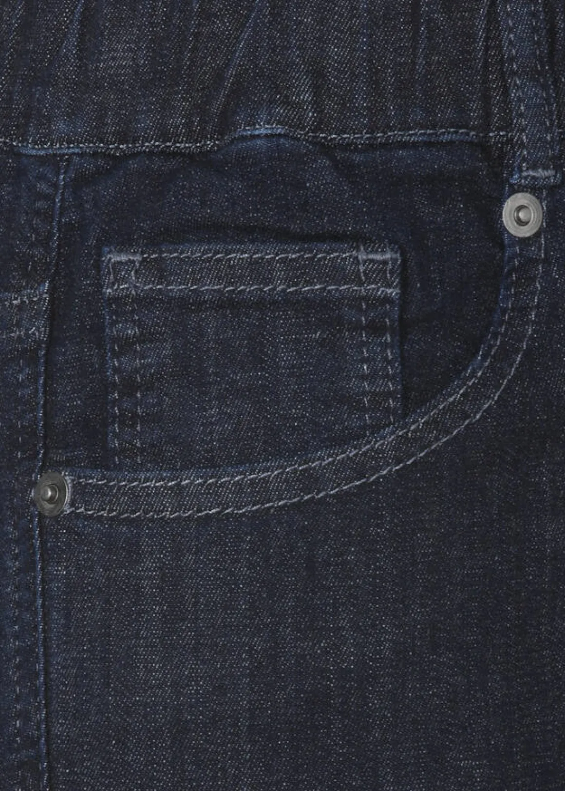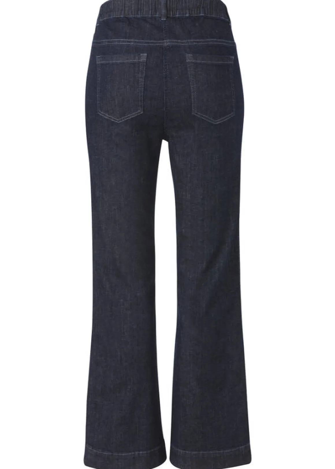 Bequeme Stretch-Jeans in dunklem Blauton mit nach unten leicht ausgestellten Beinen und bequemen, passgenauem Gummizug-Bund.
