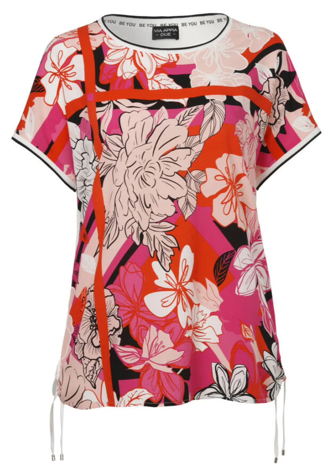 VIA APPIA DUE bringt mit diesem Blusenshirt Blumen in Ihren Kleiderschrank! Es begeistert jedoch nicht nur mit seinem grafischen, floralen Front-Print. Durch die unifarbene Rückseite entsteht ein spannender Kontrast zur Aufsehen erregend gestalteten Vorderseite und die kurzen Ärmel mit Rippbündchen strahlen sommerliche Leichtigkeit aus. Der gerade Schnitt mit seitlich gerafftem Bund schafft zudem eine bequeme Passform, die zusammen mit der hautfreundlichen Viskose optimalen Tragekomfort bietet.