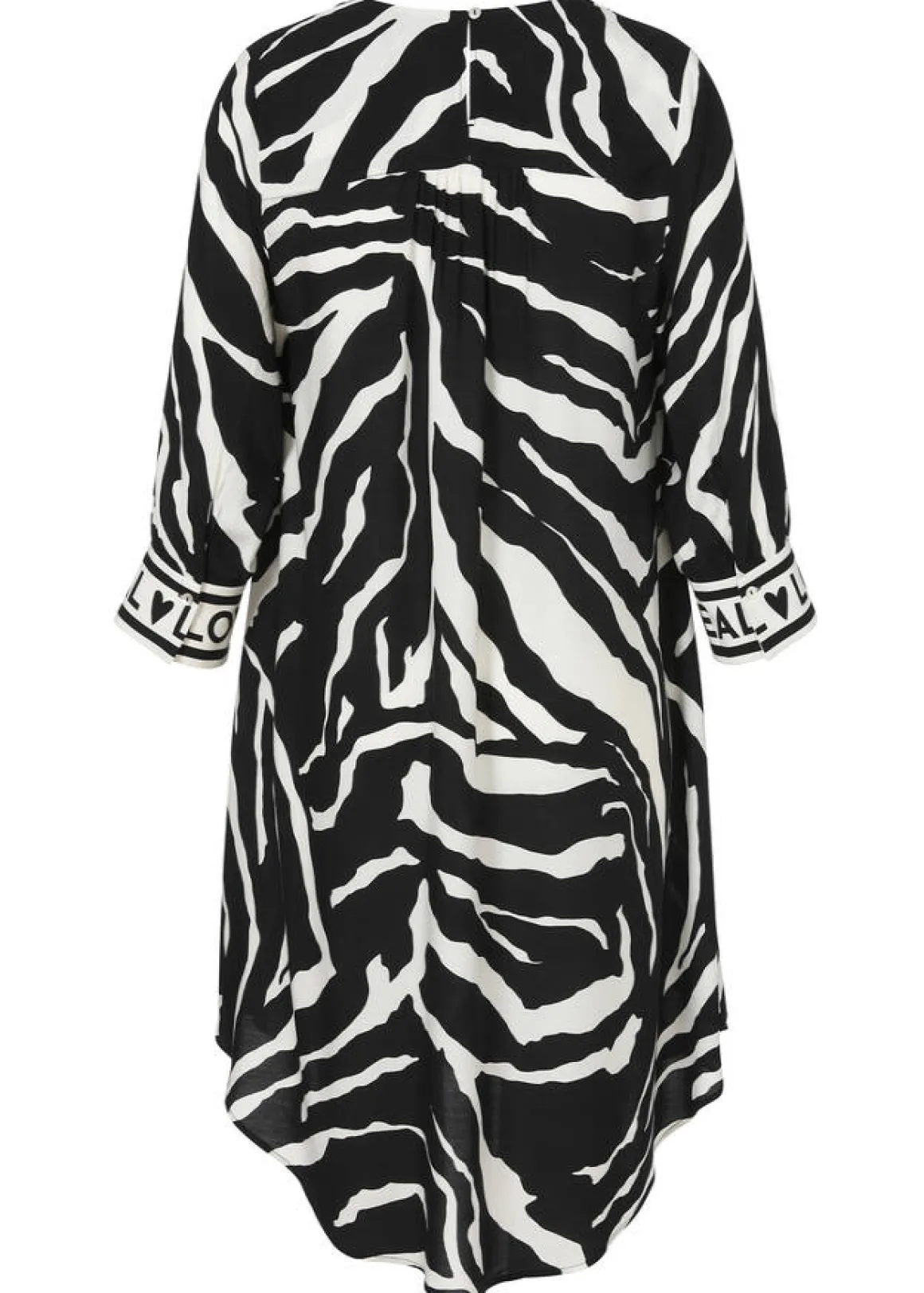 Fließendes Viskose-Kleid mit coolem Zebra-Print. Nach unten ausgestellter A-Schnitt und Dreiviertelärmel für ein locker-luftiges Tragegefühl.