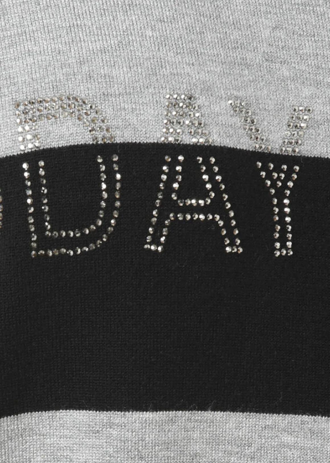 Edler Feinstrickpullover mit Streifen in Schwarz / Grau Melange geschmückt mit Buchstaben aus Silbersteinchen.