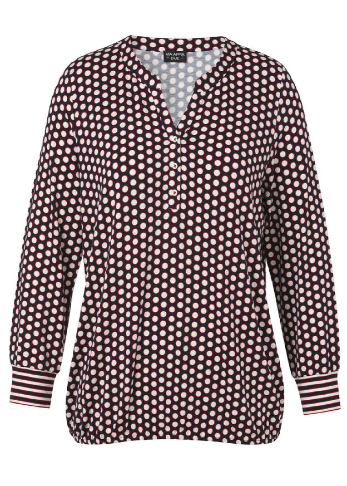 Feminines Print-Shirt mit Allovermuster in maritimer Farbharmonie. Durch den Gummizug im Saum wird der Bauch gekonnt umspielt und nichts verrutscht.
