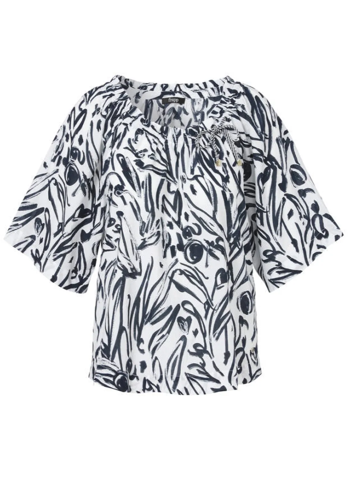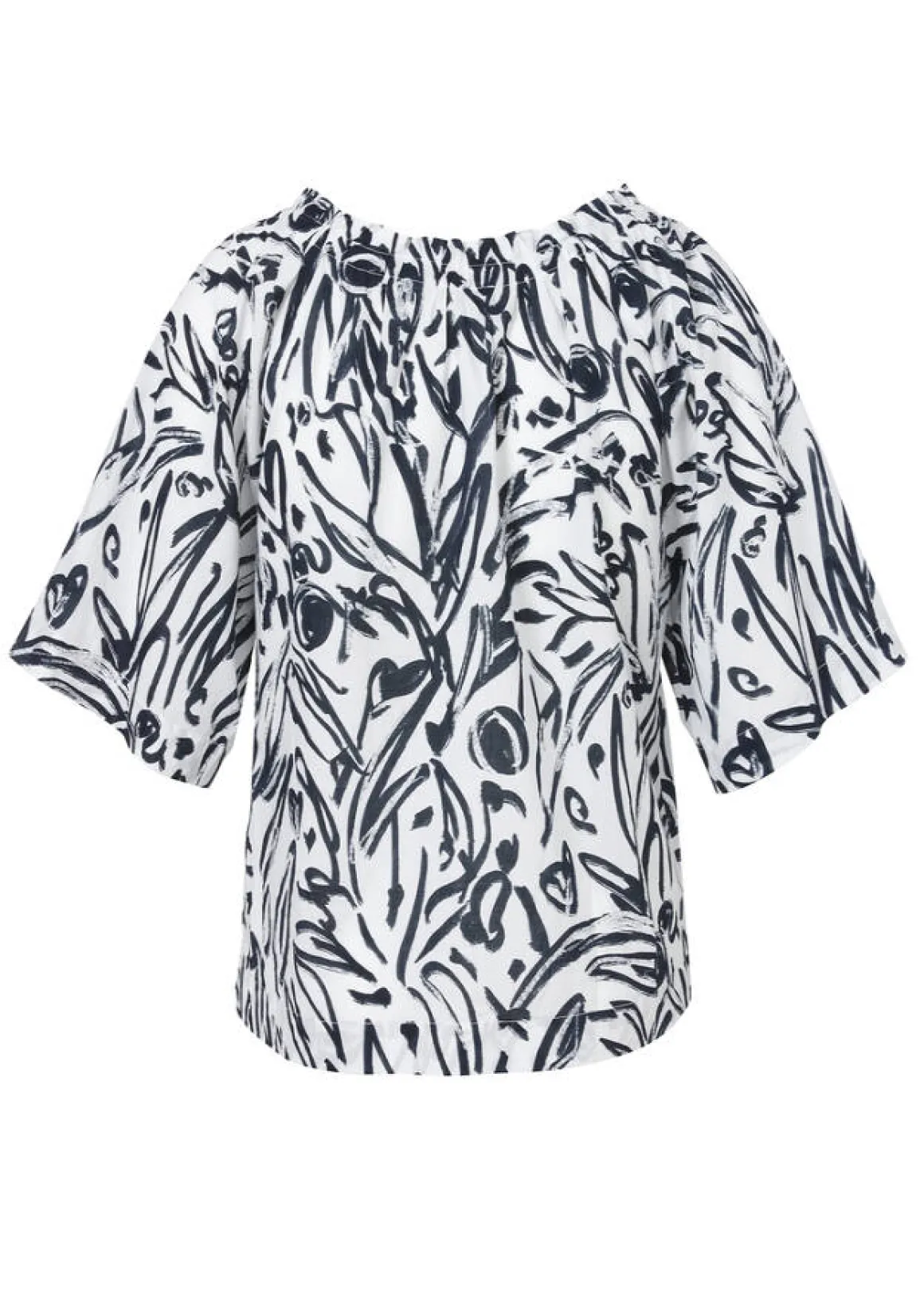 Feminine Sommer-Halbarmbluse aus reiner, zarter Baumwolle. Weiß mit Allover-Print in Marineblau.