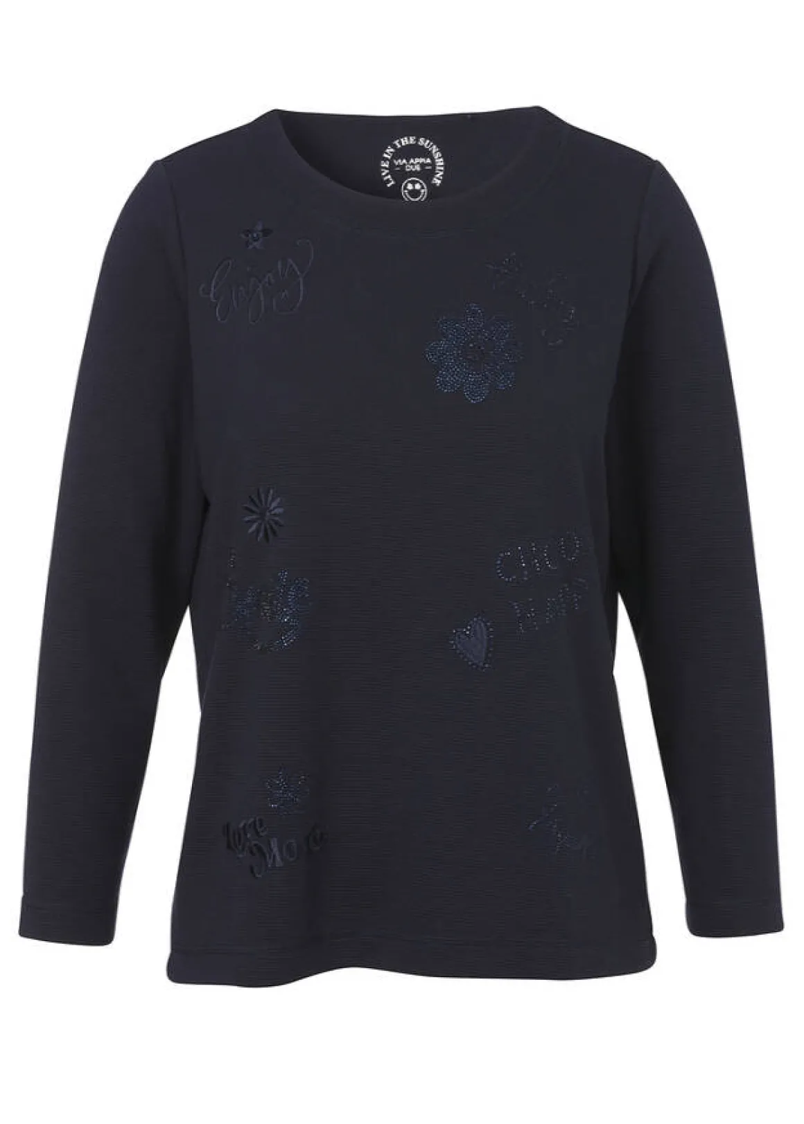 Feingeripptes Sweatshirt in dunklem Marineblau mit aufgestickten Motiven und Schmucksteinchen Ton-in-Ton. Unverwechselbares Einzelstück mit vielseitiger Kombinierbarkeit. Zeitlos schön.
