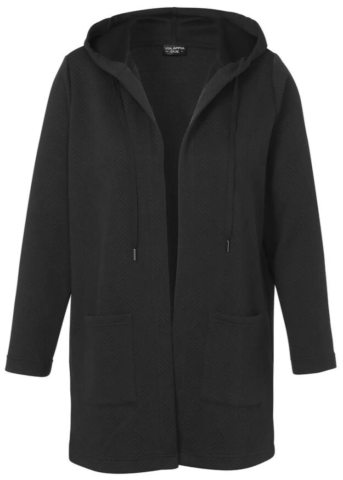 Schicke Longjacke mit Kapuze und aufgesetzten Taschen. Das einfarbige Dessin mit Strukturmuster zaubert die Kapuzenjacke zum zeitlos modischen Basicteil für vielseitige Kombinationen.