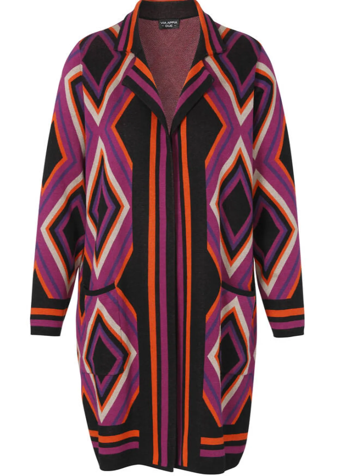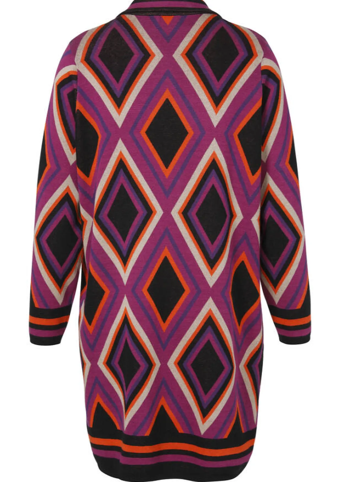 Offen fallender Cardigan in Longform mit grafischem Jacquard Mustermix in aktuellen Trendfarben aus Feinstrick im soften Baumwoll-Viskosemix. Details: chicer Reverskragen und aufgesetzte Taschen.