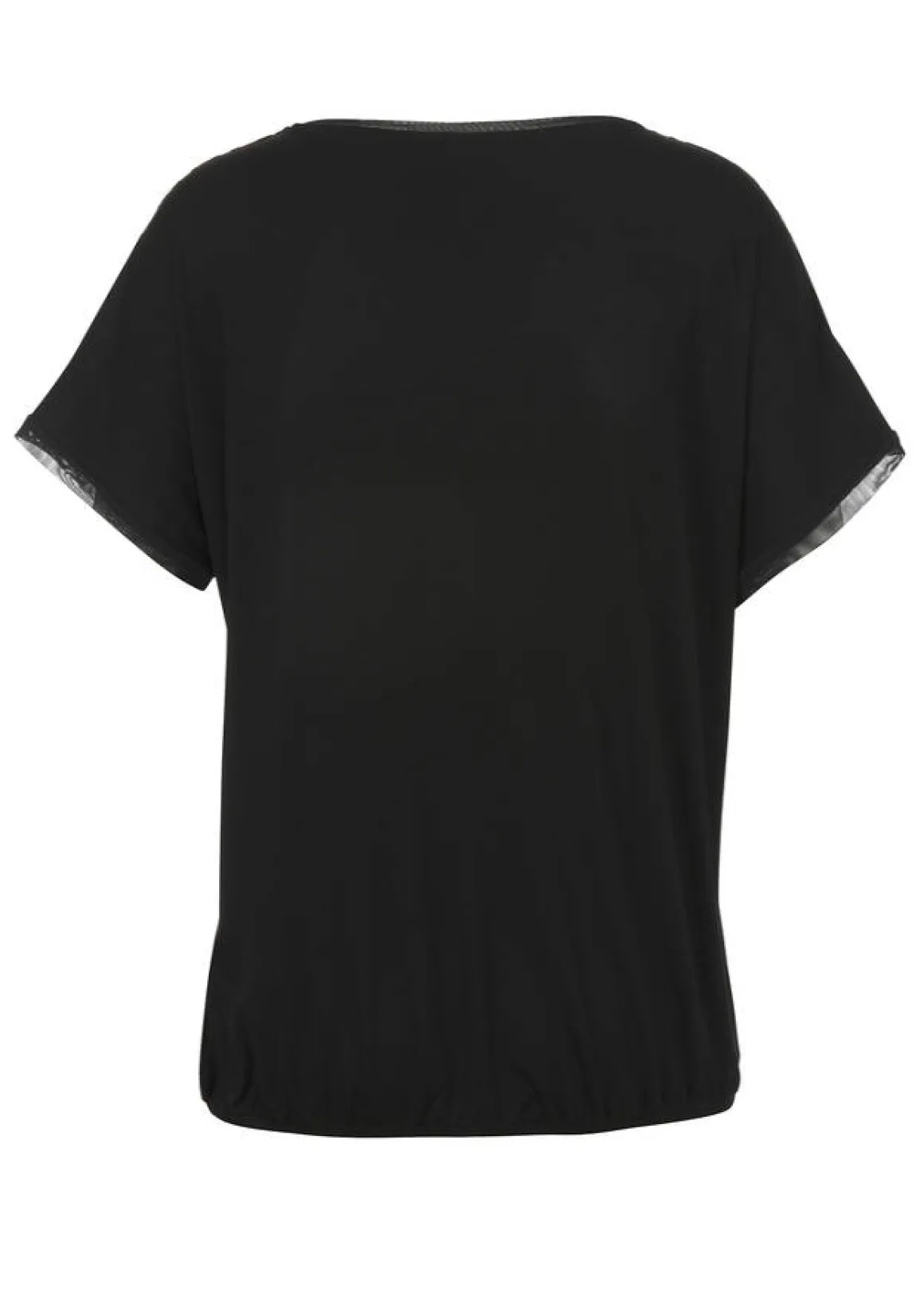 Vorne Bluse aus fließender, reiner Viskose mit Eyecatcher-Print, hinten Shirtstoff in Viskose-Jersey einfarbig Schwarz! Die Passform ist locker geschnitten und wird unten durch einen Gummizug im Saum fixiert.