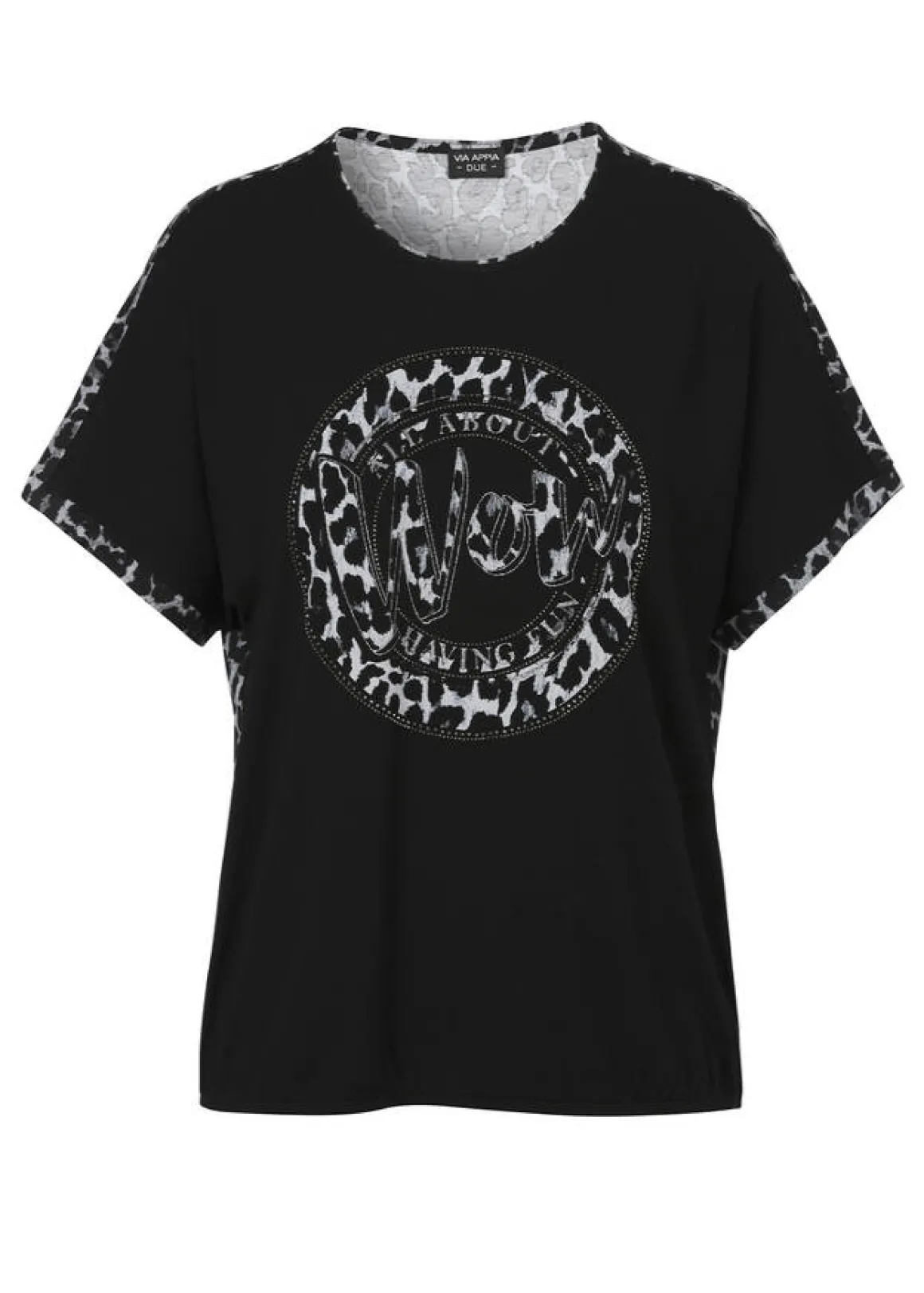 Schwarzes Shirt mit in Silber geschmücktem Front-Motiv und Details im Leomuster aus edel fließendem Viskose-Jersey.