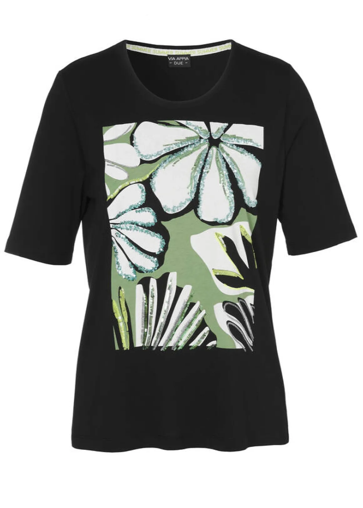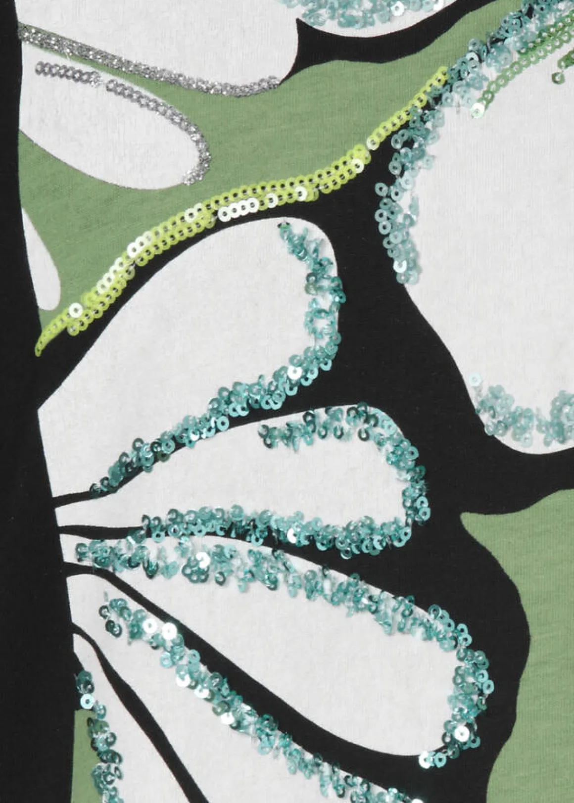 Supersoftes, schwarzes T-Shirt mit farbigen Pailletten geschmücktem Flower-Motiv auf der Vorderseite.