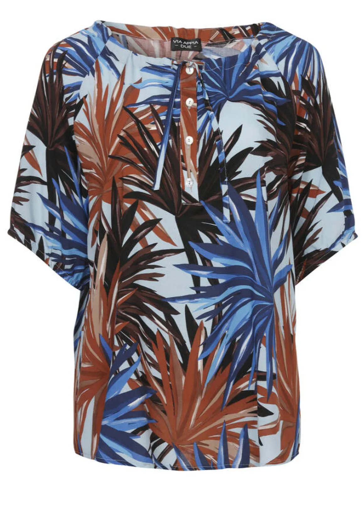 Diese sommerliche Schlupfbluse von VIA APPIA DUE gehört einfach in Ihren Kleiderschrank! Sie begeistert mit ihrem frischen Design und ihrem exotischen Allover-Muster. Die Schnürung am femininen Carmenausschnitt wirkt zudem feminin und trendig und die kurzen Raglanärmel mit elastischen Enden sind perfekt für warme Tage geeignet. Die Bluse überzeugt dabei auch mit ihrer figurumspielenden Passform und ist dank ihrer edlen Viskose besonders hautfreundlich.