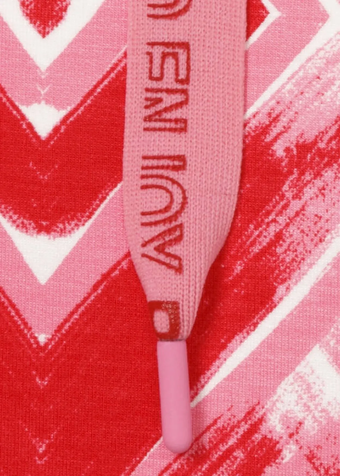 Feminines Sweatshirt mit Allover-Muster in Rot-Pink-Weiß. Breite Zierbänder schmücken den Stehkragen.