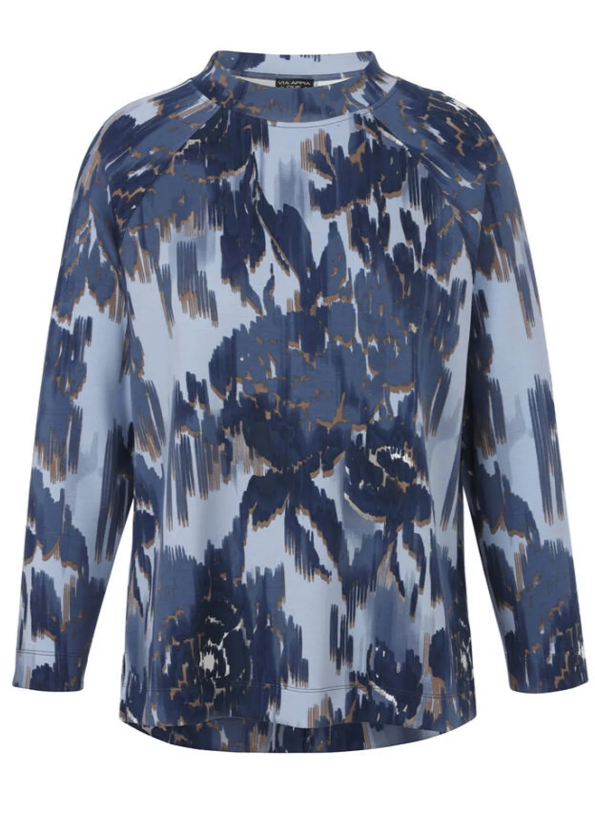 Einzigartiges Sweatshirt mit Stehkragen, Raglan-Ärmeln und Perlmuttknöpfen am Rücken. Print in edler Farbharmonie mit Blautönen und Farbton „Mokka“.
