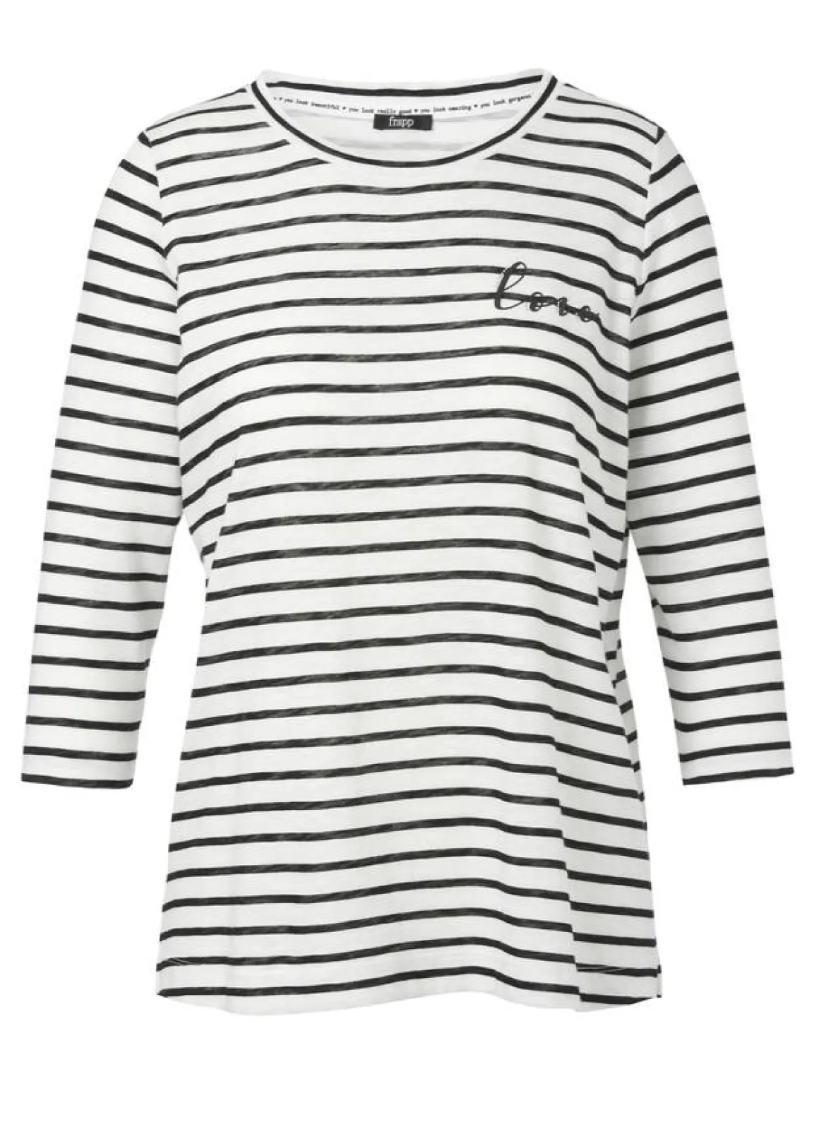 Love wird auf diesem süßen 3/4-Arm-Shirt von FRAPP zum Motto Ihres Tages! Für seine verspielte Optik sorgt die auffällige Kombi aus Statementprint, Streifen und funkelnden Glitzersteinen. Der leicht taillierte Schnitt bietet dazu eine feminine Passform und setzt Ihre Figur gekonnt in Szene. Dank der weichen Baumwolle überzeugt das Shirt außerdem auch in puncto Tragegefühl auf ganzer Linie.