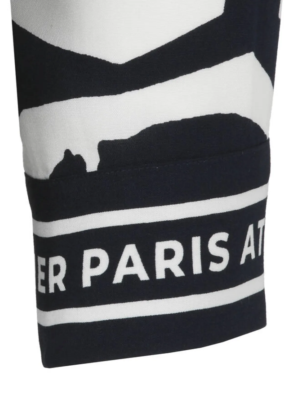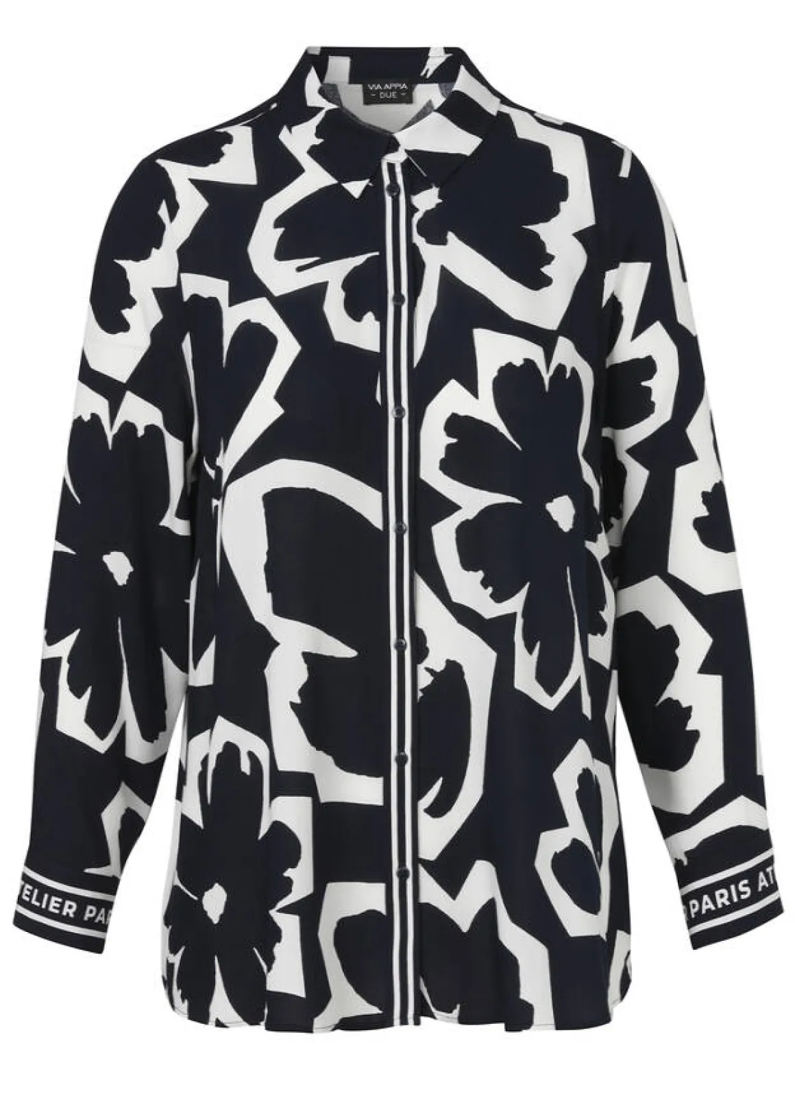 Chice Hemdbluse aus fließender Viskose mit floralem Allover-Print un dunklem Marineblau auf naturweißem Grund.