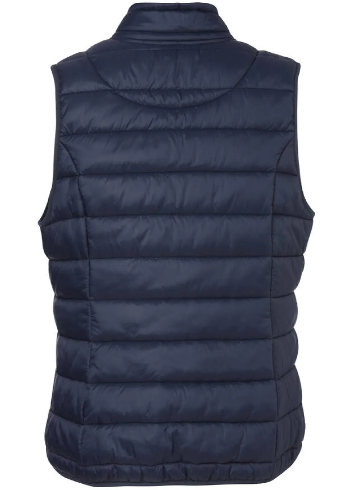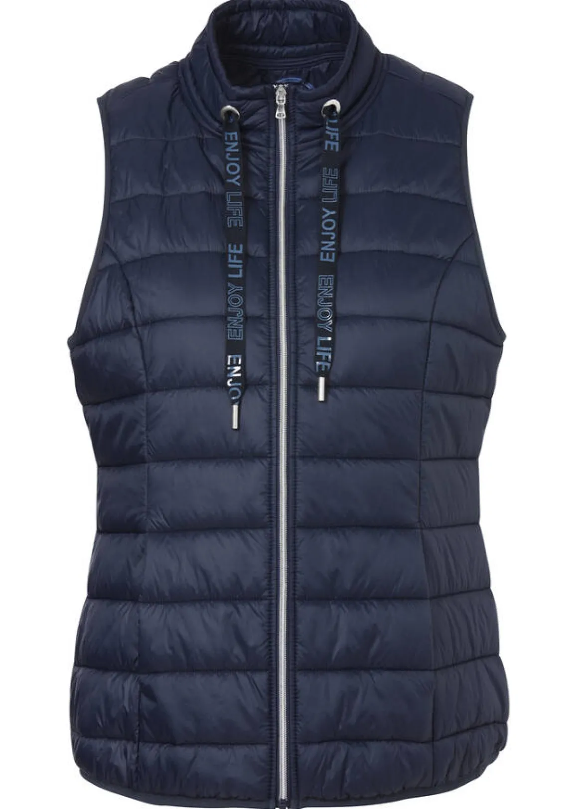 Vielseitige, kombistarke Steppweste in Marineblau in wind-und wasserabweisender Qualität. Mit Zipperverschluss und einem Stehkragen mit schmückendem Bindeband.