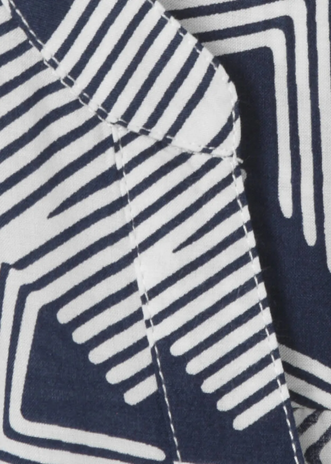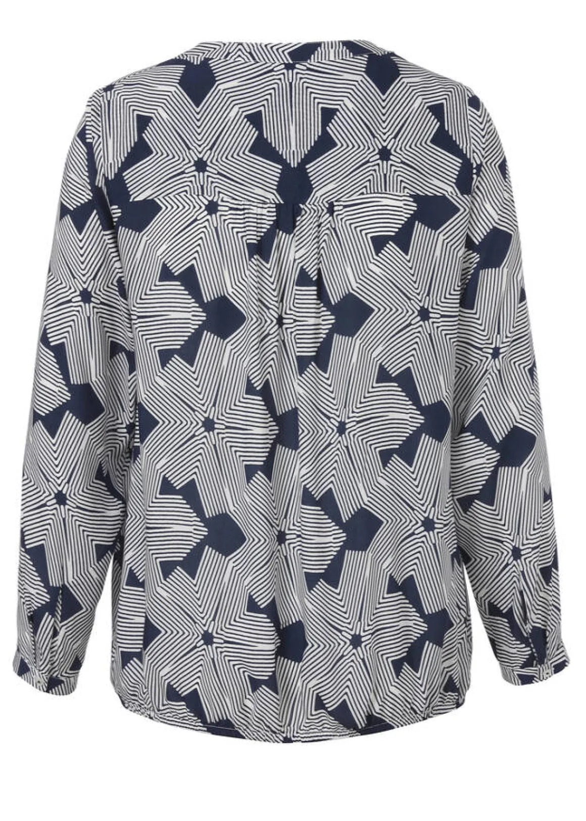 Zarte Schlupfbluse aus reiner Viskose mit Allover-Print zweifarbig Blau-Weiß . Der lockere Schnitt umspielt gekonnt den Bauch und wird mit dem Gummizug im Saum individuell reguliert.