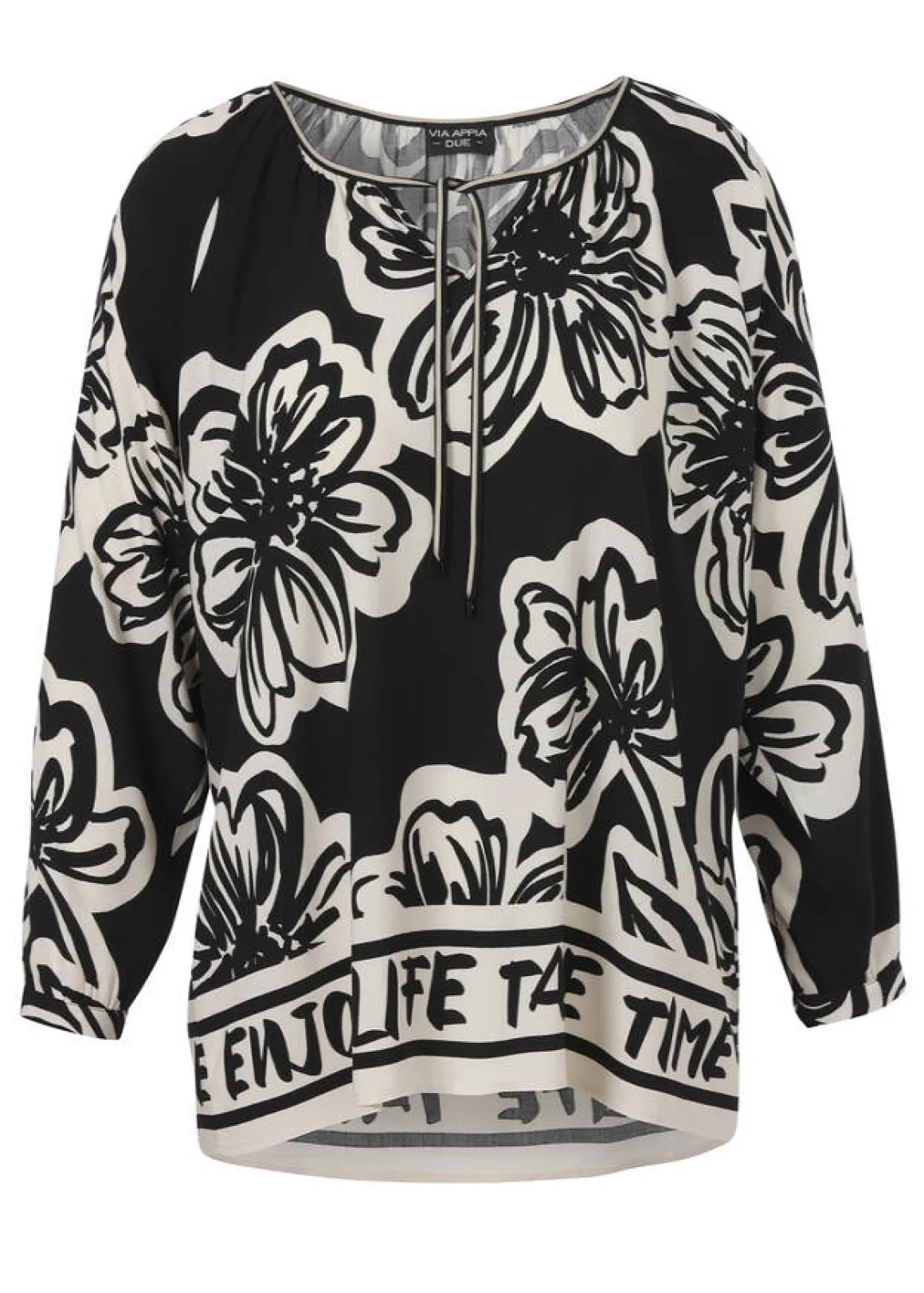 Zarte, zweifarbige Tunika mit Blumenmuster und Slogan am Bund in Schwarz / Champagner.