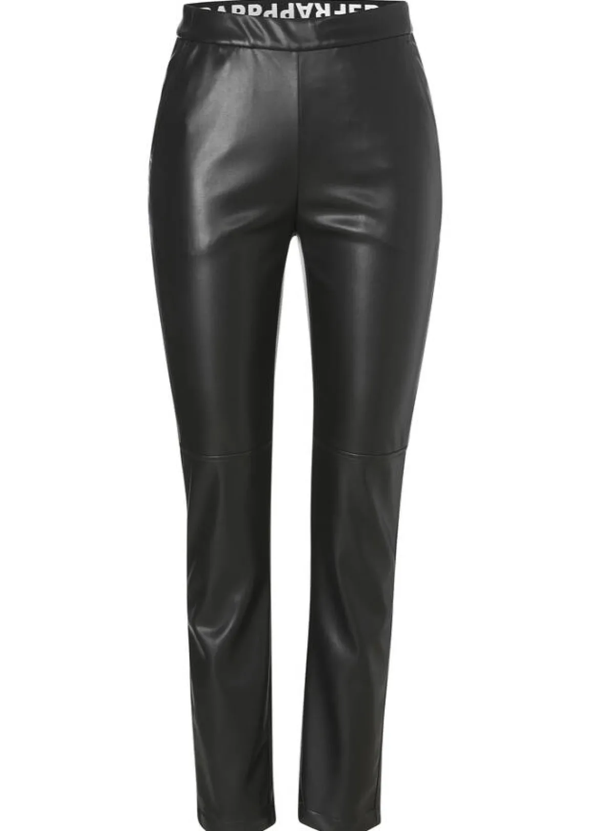 Edle Schlupfhose in Lederoptik mit schmalen Beinen im kombistarken Schwarz. Ein hochwertiges zeitloses Basic für Ihre Grundgarderobe. Die Hose aus veganem Leder verleiht jedem Outfit einen coolen Touch.