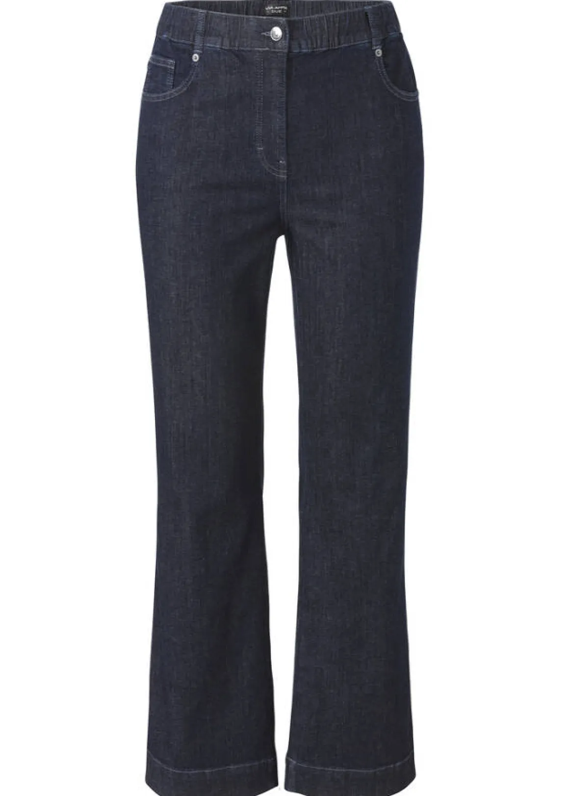 Bequeme Stretch-Jeans in dunklem Blauton mit nach unten leicht ausgestellten Beinen und bequemen, passgenauem Gummizug-Bund.