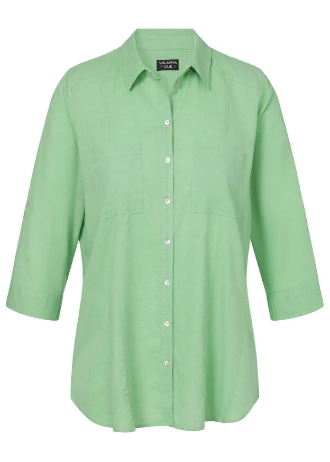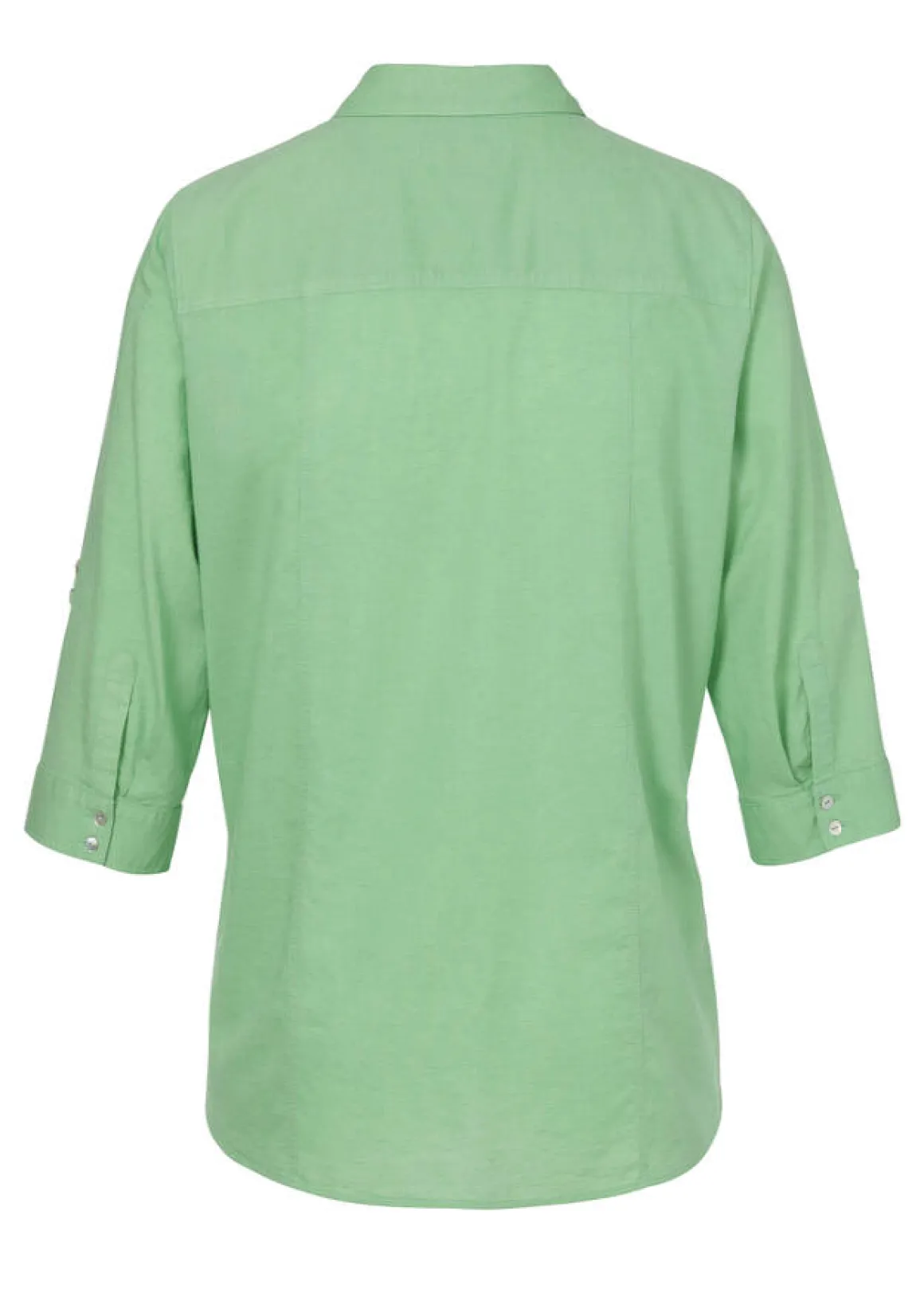 Klassische, zeitlos chice Dreiviertelarm-Hemdbluse in hellem Grün. Der edle Baumwoll-Leinen-Mix sorgt für höchsten Tragekomfort auch an heißen Tagen. Bluse wird im Sommer auch als dünnes Jäckchen getragen!