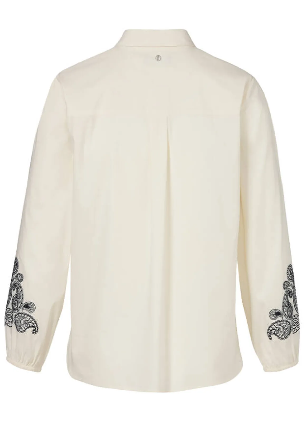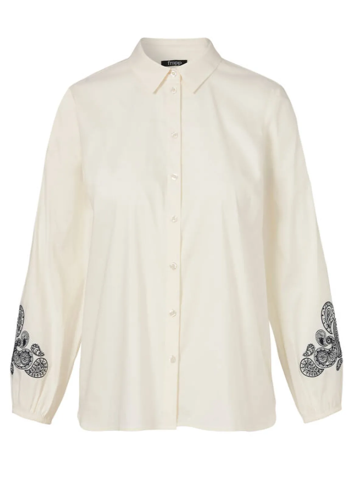 Edle Hemdbluse im ganz sanften Pastellgelbton Butter mit dunkelblauer Stickerei an den Ärmeln. Sehr hochwertiges, angenehmes Material im Baumwollmix mit Stretchanteil.
