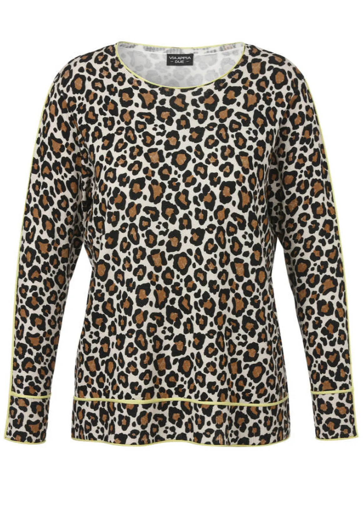 Chicer Feinstrick-Pullover mit Leomuster in edler Farbharmonie und limettenfarbigen Biesen als Kontrast-Details.