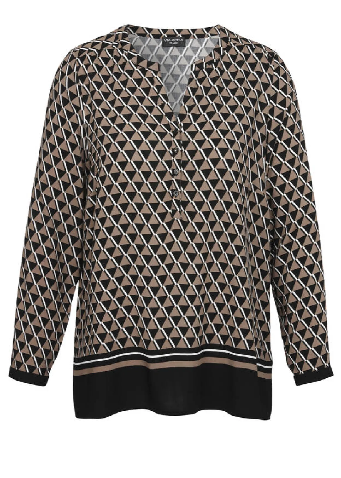 Feminine Schlupf-Bluse aus reiner, fließender Viskose mit Allover-Print in edler Farbharmonie Schwarz, Weiss, Mokka.