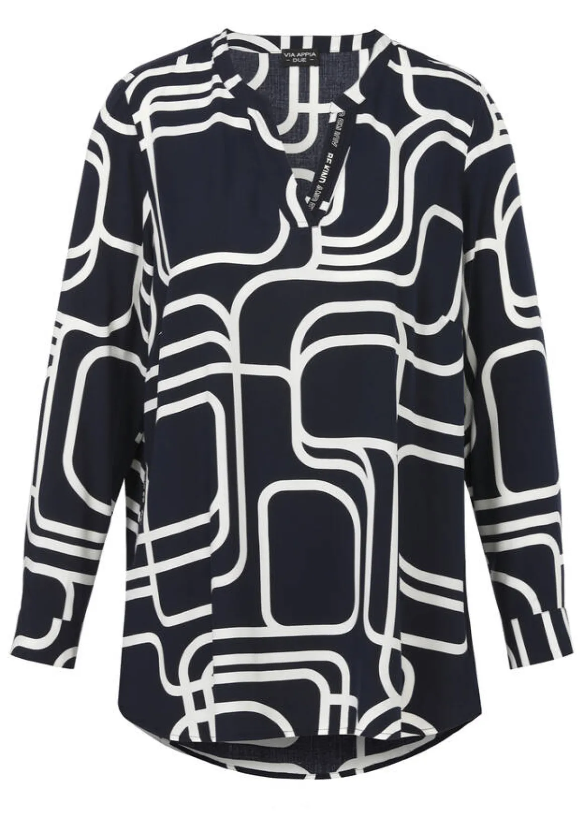 Feine Viskose-Tunika aus edler Viskose in Marineblau mit cremefarbenem, grafischem Print. Luftig, weit geschnitten für höchsten Tragekomfort.