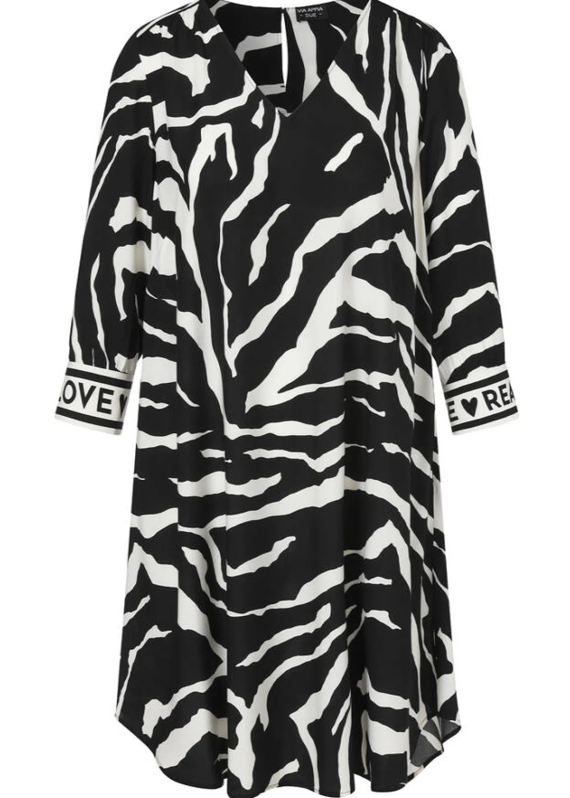 Fließendes Viskose-Kleid mit coolem Zebra-Print. Nach unten ausgestellter A-Schnitt und Dreiviertelärmel für ein locker-luftiges Tragegefühl.