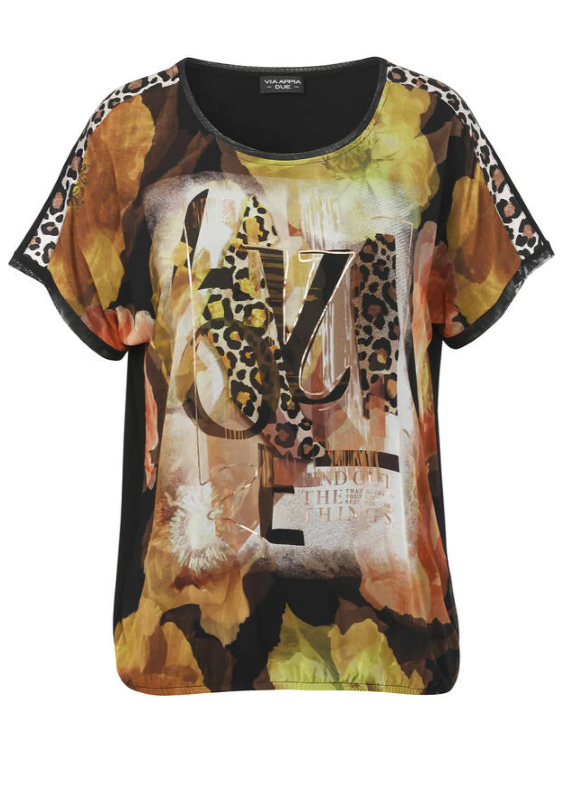 Vorne Bluse aus fließender, reiner Viskose mit Eyecatcher-Print, hinten Shirtstoff in Viskose-Jersey einfarbig Schwarz! Die Passform ist locker geschnitten und wird unten durch einen Gummizug im Saum fixiert.