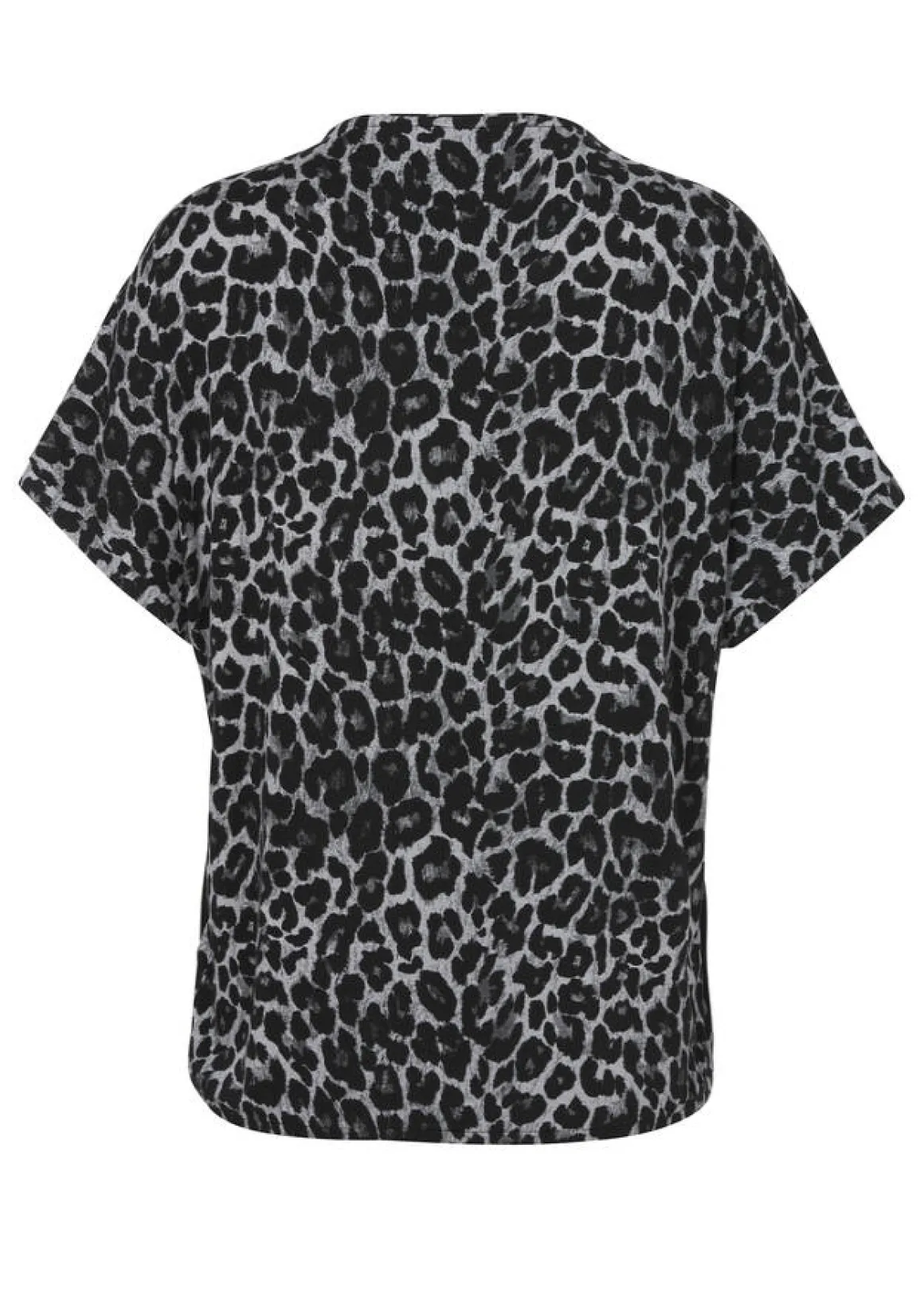 Schwarzes Shirt mit in Silber geschmücktem Front-Motiv und Details im Leomuster aus edel fließendem Viskose-Jersey.