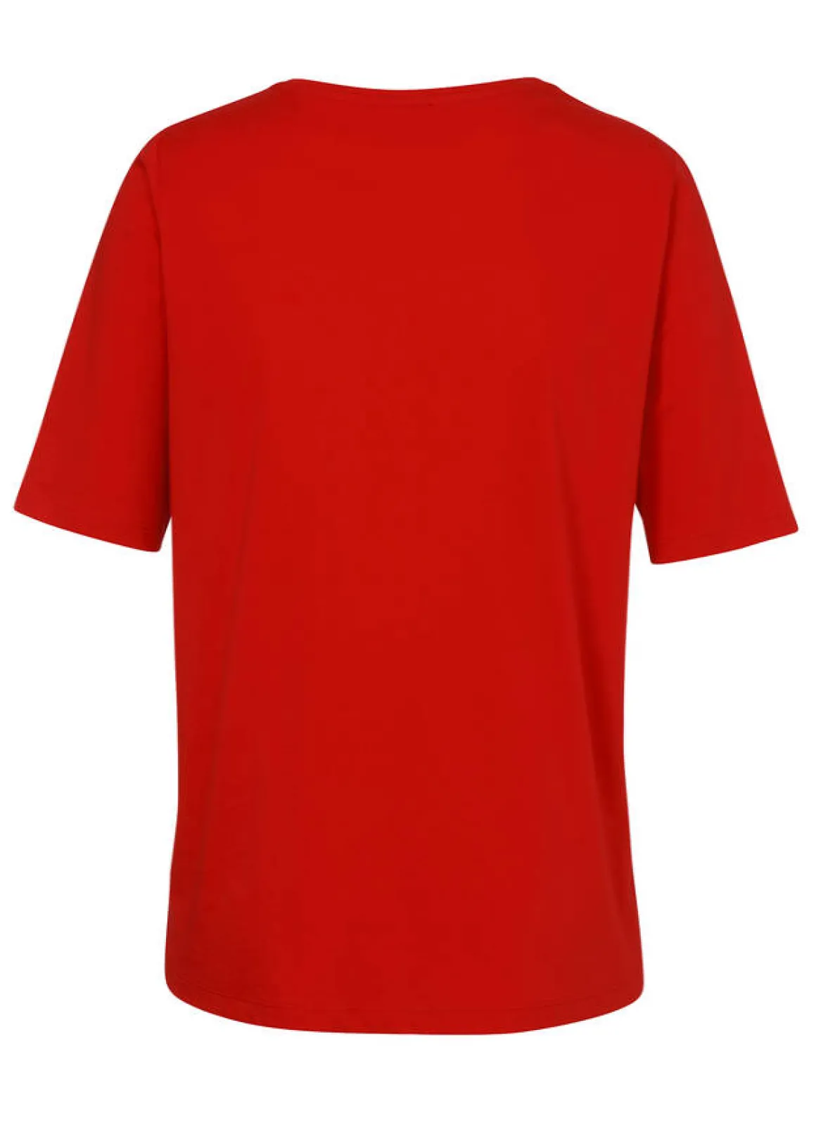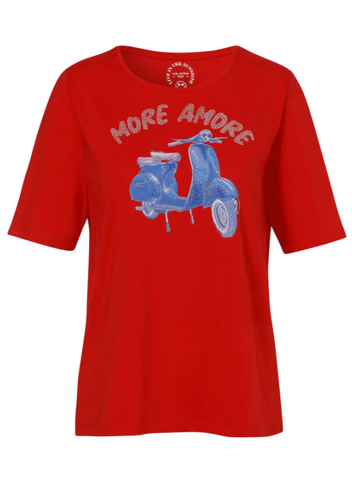 Dolce Vita zum Anziehen! Tomatenrotes Sommer-Shirt aus softer Baumwolle mit attraktivem Vespa-Motiv auf der Vorderseite und Lettern aus kleinen Silbersteinchen „More Amore“.