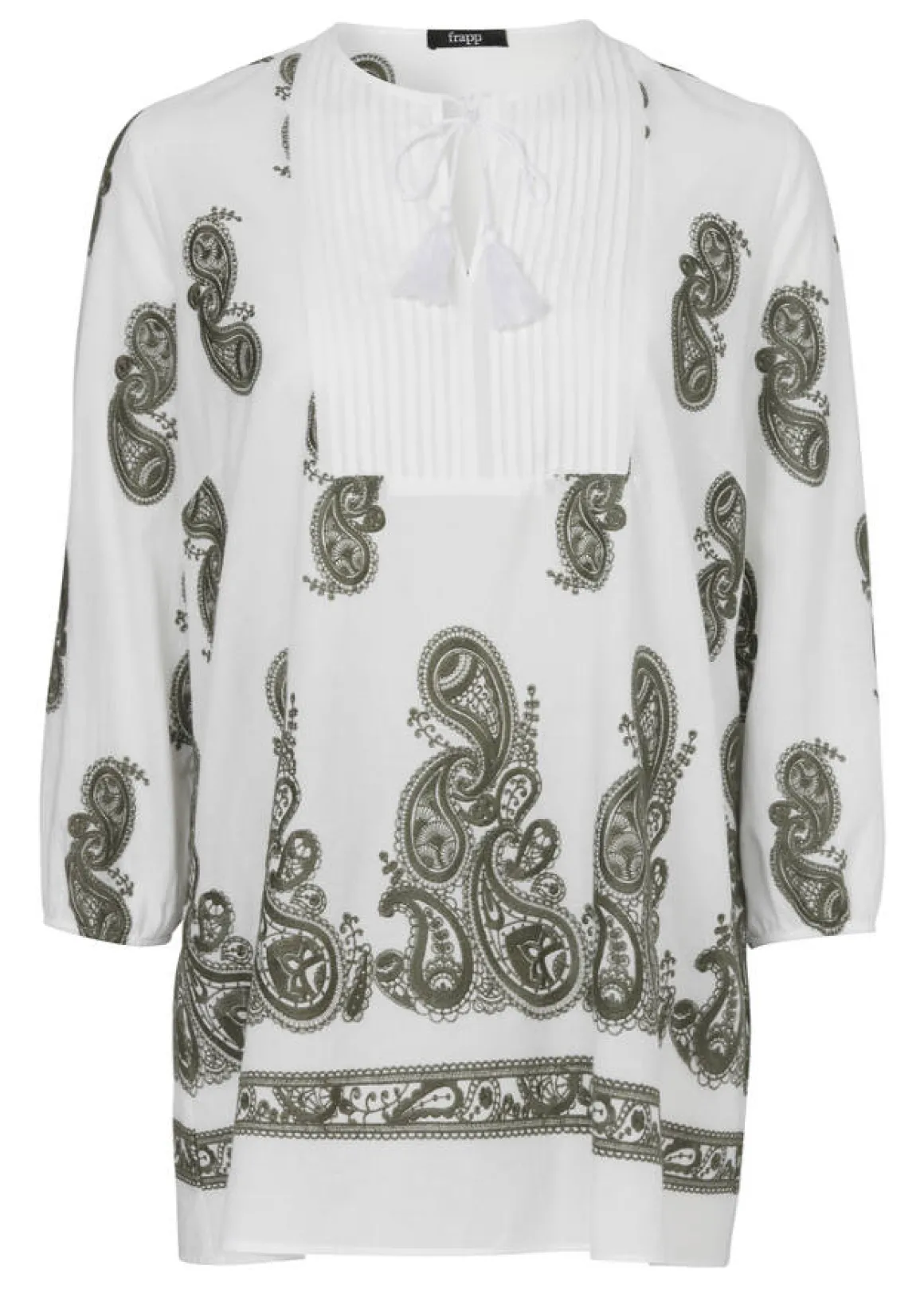 Business, Freizeit oder Party, diese Tunika von FRAPP lässt sich einfach in Ihren Alltag integrieren. Die trendigen Paisley-Stickereien wirken wunderbar sommerlich und ziehen alle Blicke auf sich. Die Tunika begeistert zudem mit ihrer luftigen Optik und zarten Biesen am Ausschnitt. Dank der Ärmel in 3/4-Länge ist sie dabei besonders an wärmeren Tagen angenehm zu tragen. Zusätzlich sorgen der gerade Schnitt und die weiche Baumwolle für optimalen Komfort.