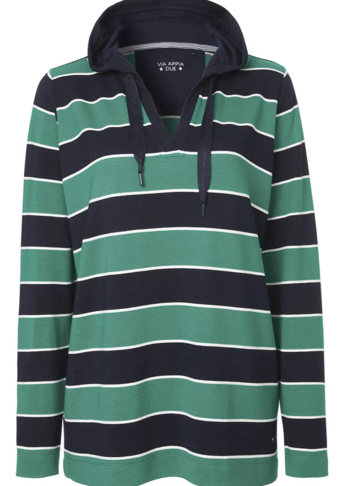 Glänzende Glitzerdetails machen dieses figurumspielende Sweatshirt von VIA APPIA DUE zum idealen Kombiteil für Ihre Freizeit. Das gestreifte Allover-Muster zaubert in Verbindung mit der Kapuze eine sportive Optik. Seine Viskosemischung macht das Sweatshirt dabei fließend und hautfreundlich.