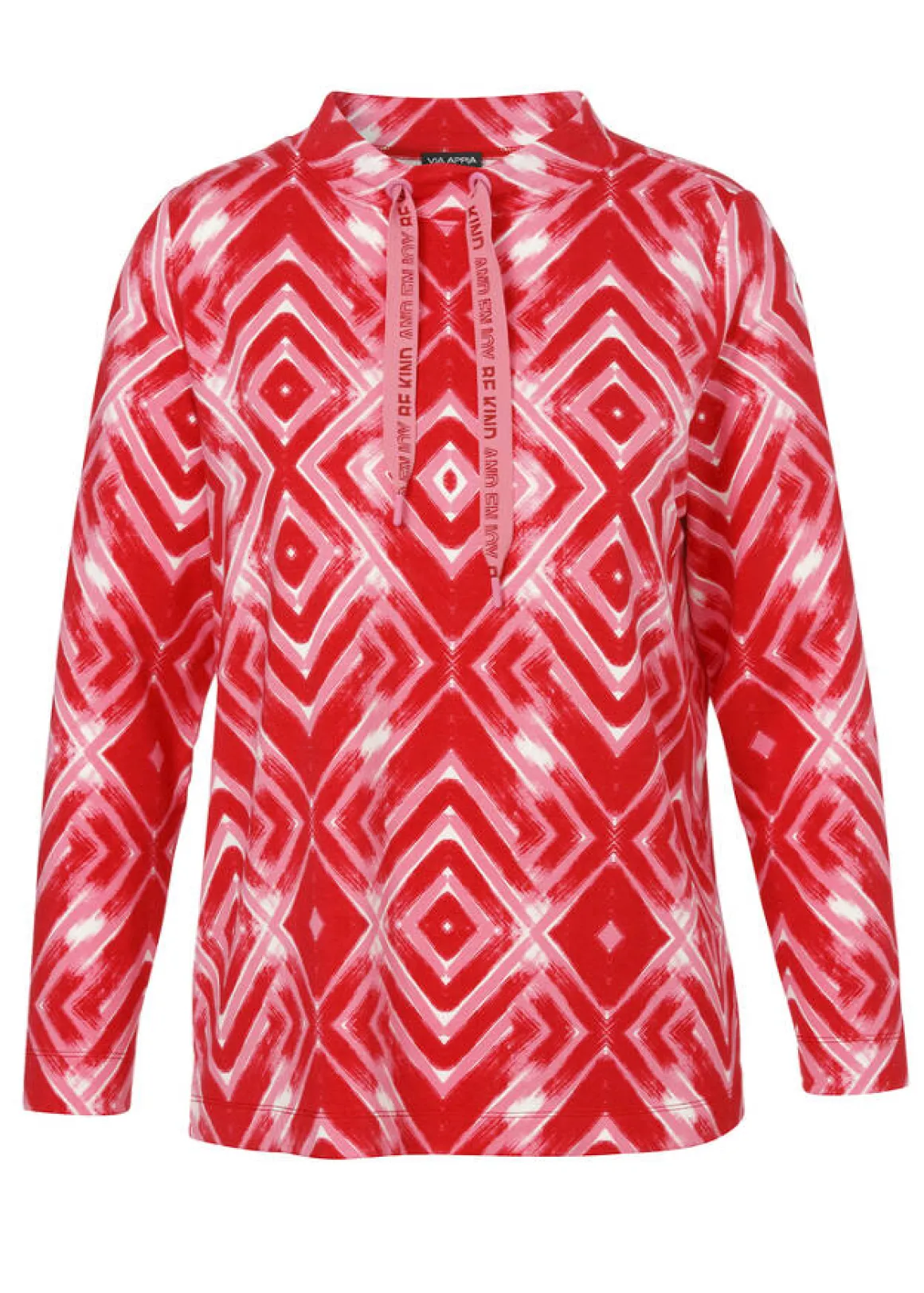 Feminines Sweatshirt mit Allover-Muster in Rot-Pink-Weiß. Breite Zierbänder schmücken den Stehkragen.