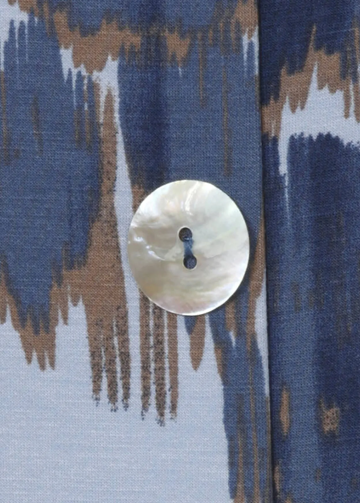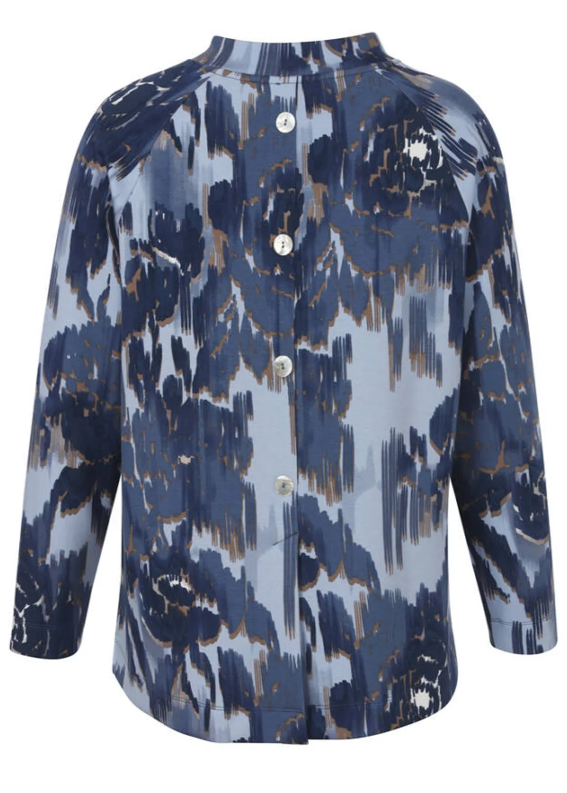 Einzigartiges Sweatshirt mit Stehkragen, Raglan-Ärmeln und Perlmuttknöpfen am Rücken. Print in edler Farbharmonie mit Blautönen und Farbton „Mokka“.