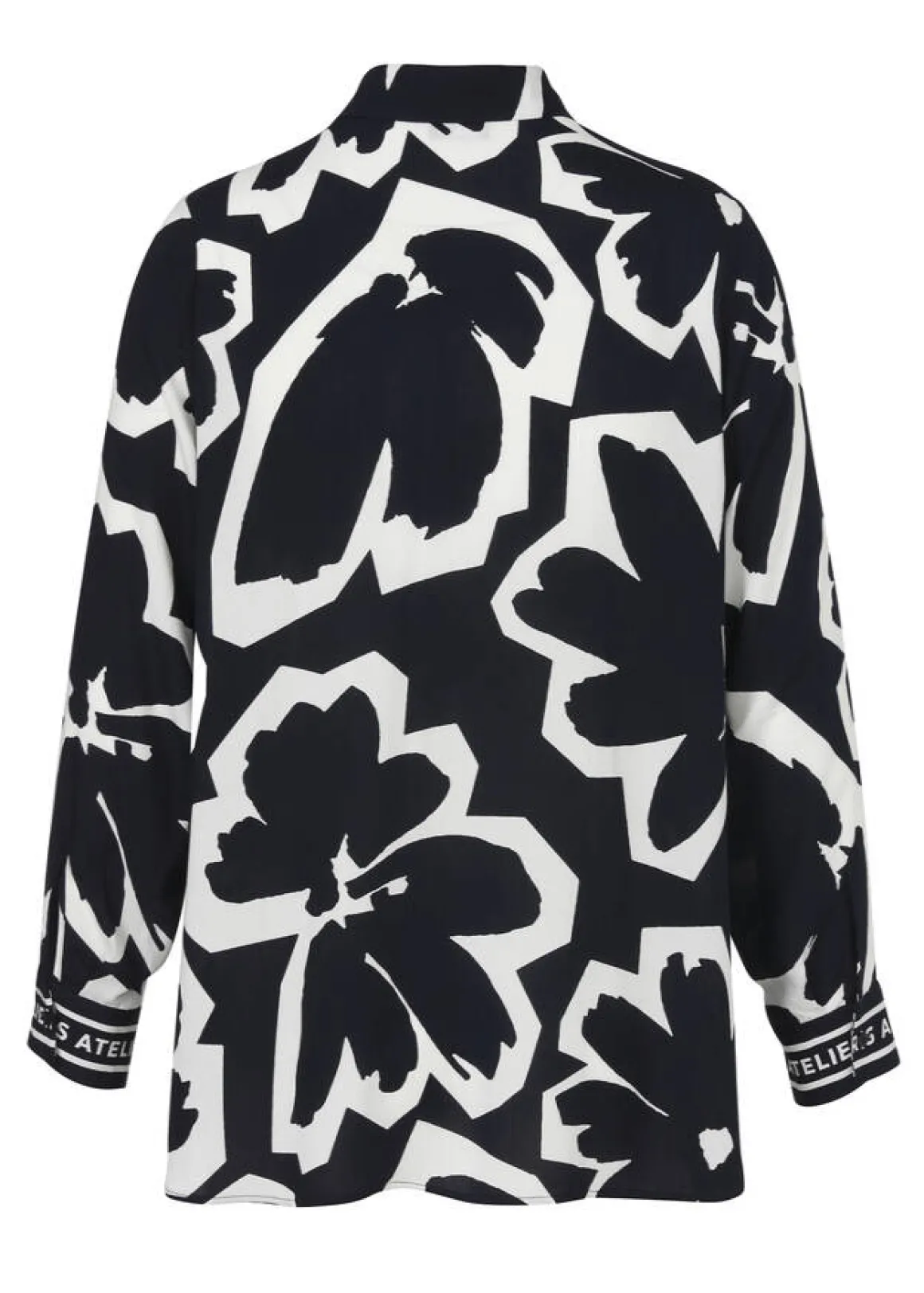 Chice Hemdbluse aus fließender Viskose mit floralem Allover-Print un dunklem Marineblau auf naturweißem Grund.