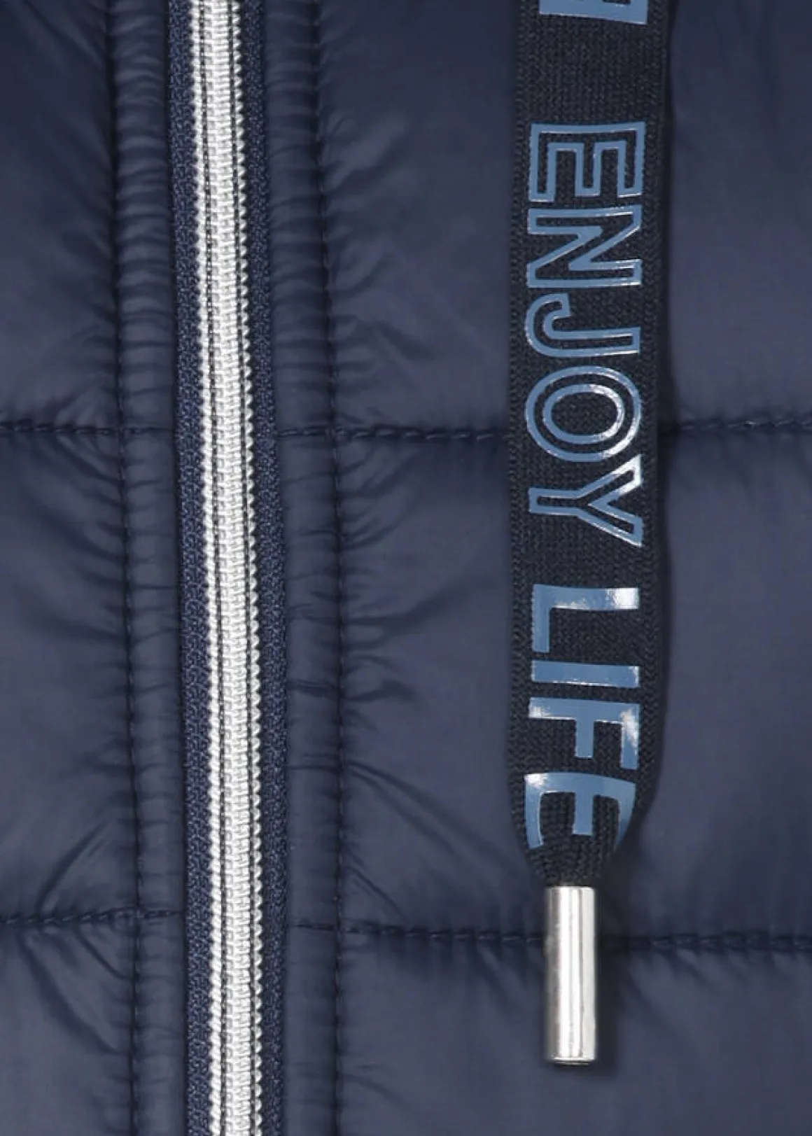 Vielseitige, kombistarke Steppweste in Marineblau in wind-und wasserabweisender Qualität. Mit Zipperverschluss und einem Stehkragen mit schmückendem Bindeband.