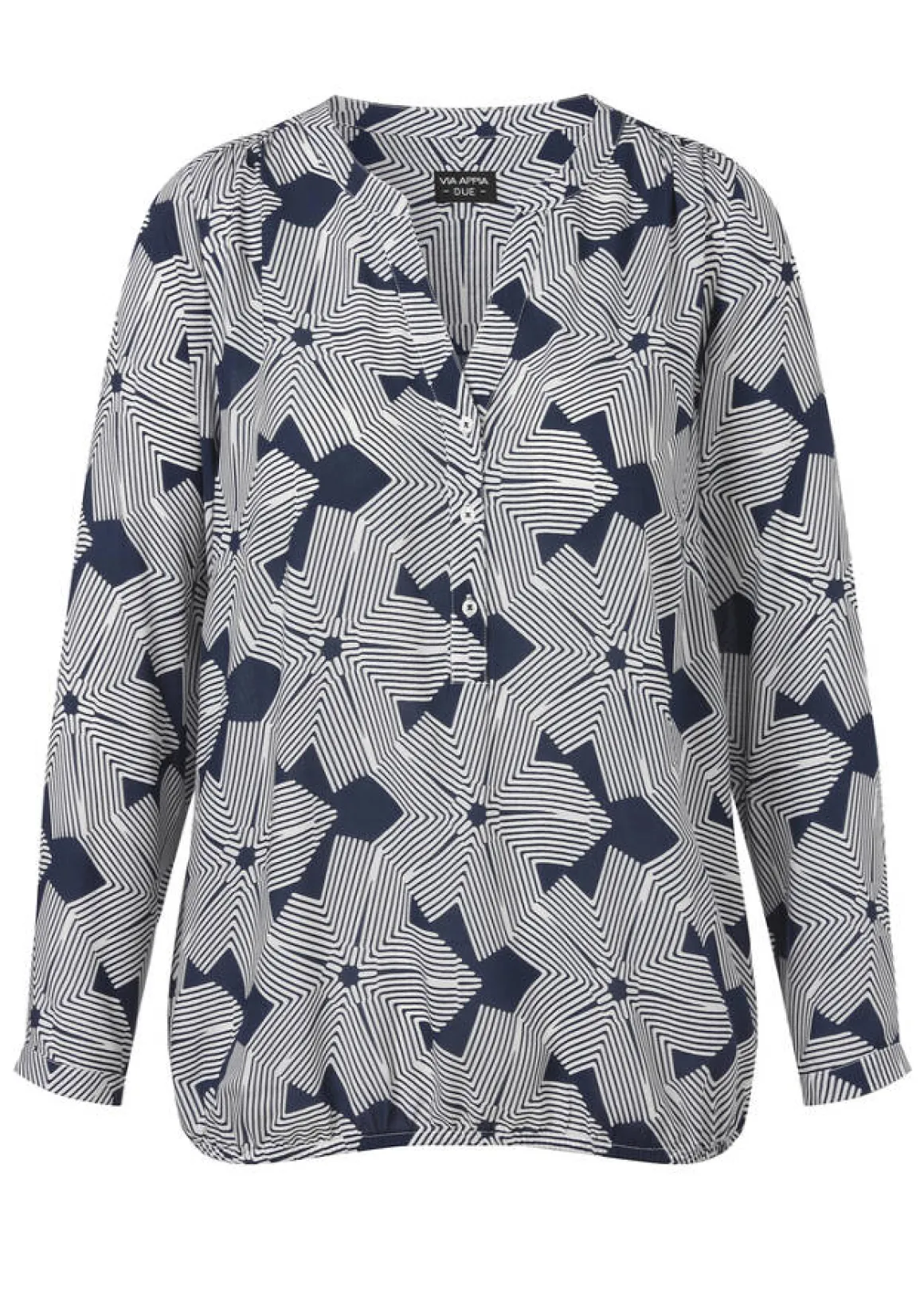Zarte Schlupfbluse aus reiner Viskose mit Allover-Print zweifarbig Blau-Weiß . Der lockere Schnitt umspielt gekonnt den Bauch und wird mit dem Gummizug im Saum individuell reguliert.