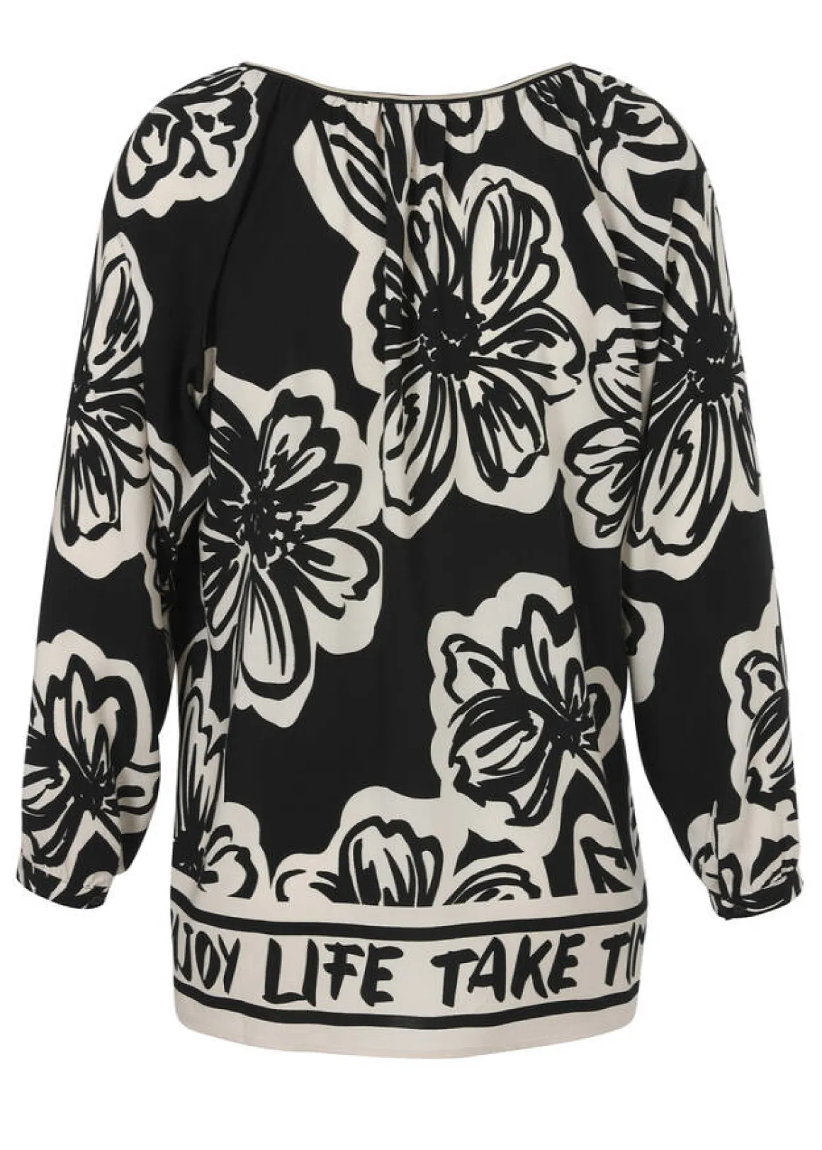 Zarte, zweifarbige Tunika mit Blumenmuster und Slogan am Bund in Schwarz / Champagner.
