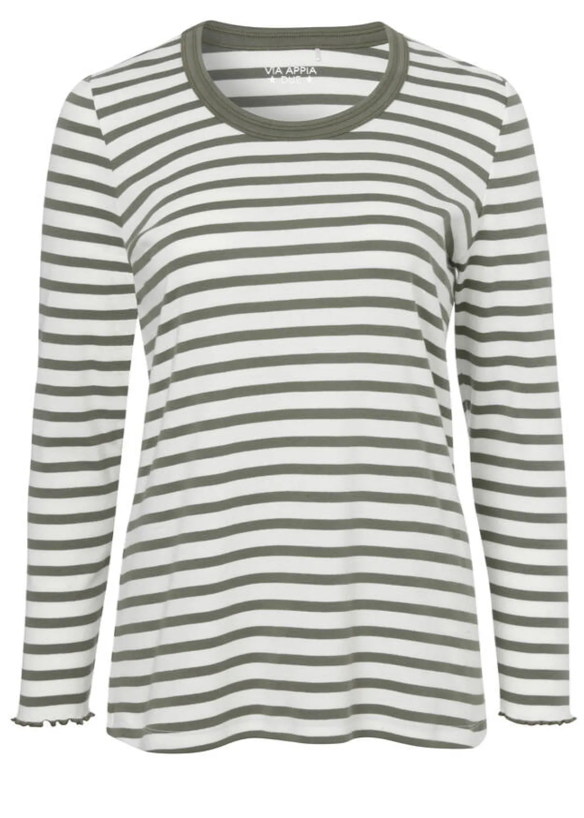 VIA APPIA DUE bringt mit diesem Langarmshirt frischen Wind in Ihren Kleiderschrank! Zugleich stylisch und klassisch präsentiert es sich mit einem gestreiften Allover-Muster. Dank der langen Ärmel mit Wellensaum brauchen Sie auch an kühlen Sommer-Tagen nicht zu frieren und die körpernahe Passform akzentuiert Ihre Silhouette perfekt. Mit seiner bequemen Baumwolle ist das Shirt dabei wunderbar weich.