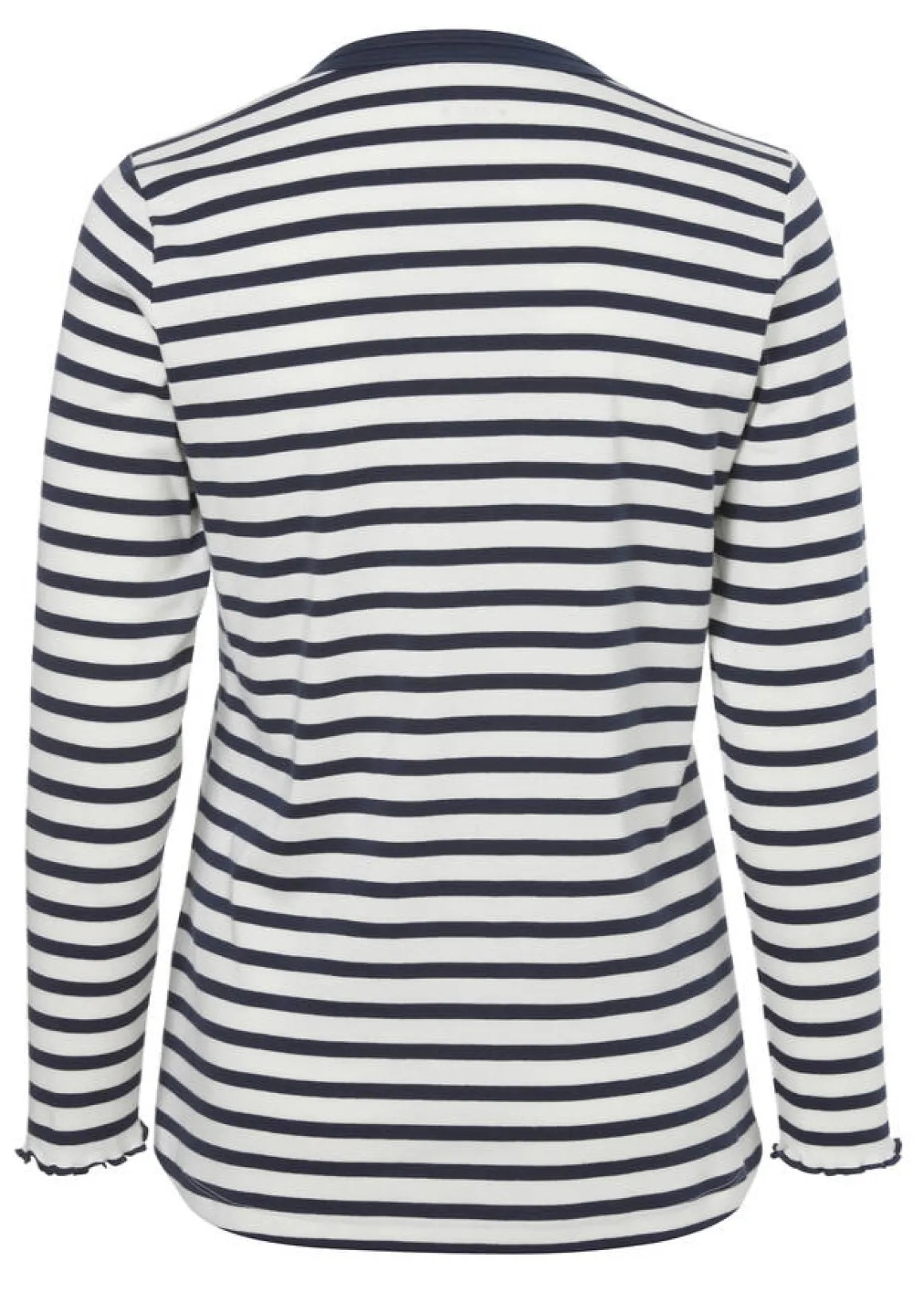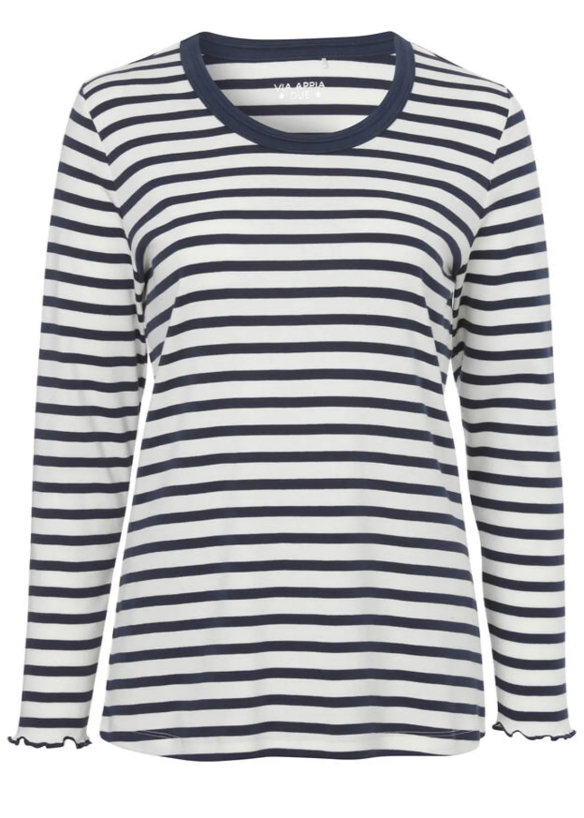 VIA APPIA DUE bringt mit diesem Langarmshirt frischen Wind in Ihren Kleiderschrank! Zugleich stylisch und klassisch präsentiert es sich mit einem gestreiften Allover-Muster. Dank der langen Ärmel mit Wellensaum brauchen Sie auch an kühlen Sommer-Tagen nicht zu frieren und die körpernahe Passform akzentuiert Ihre Silhouette perfekt. Mit seiner bequemen Baumwolle ist das Shirt dabei wunderbar weich.